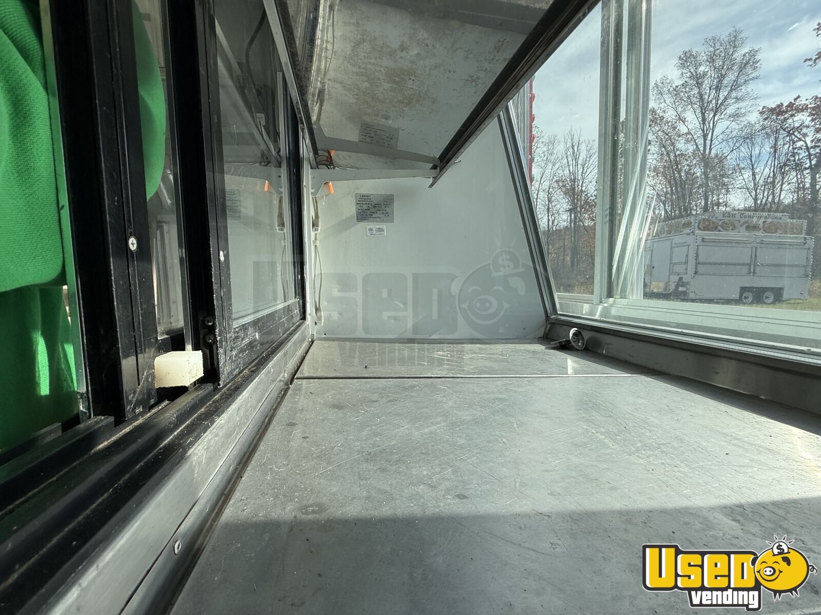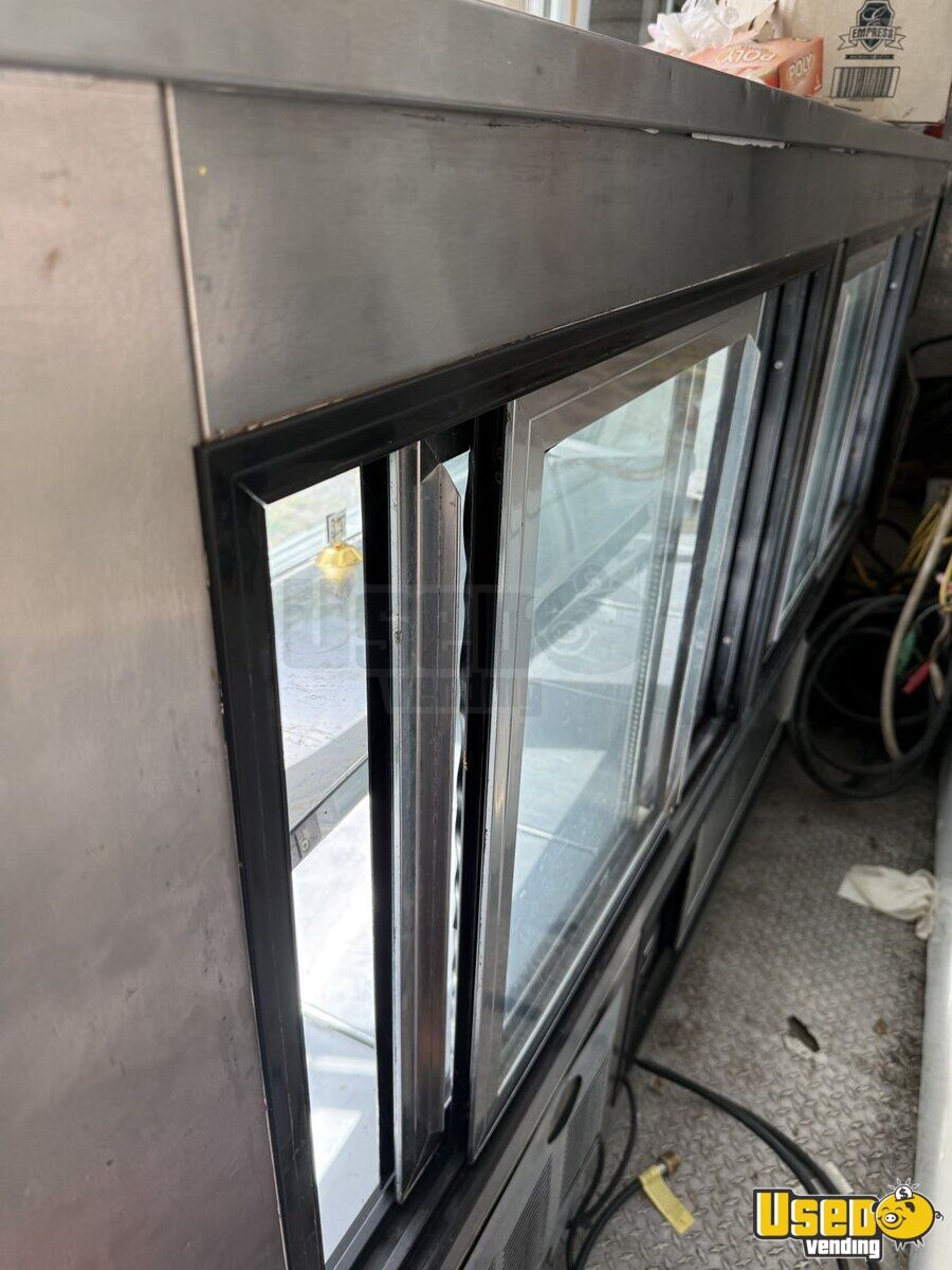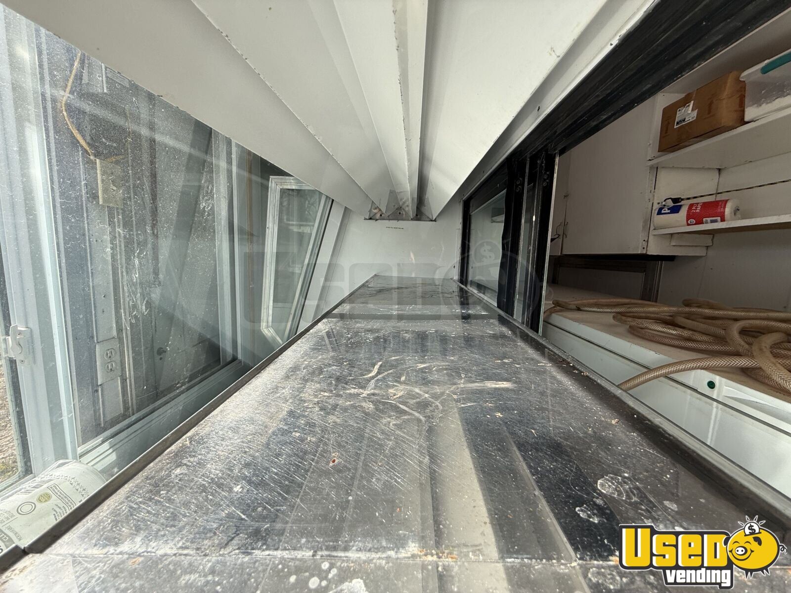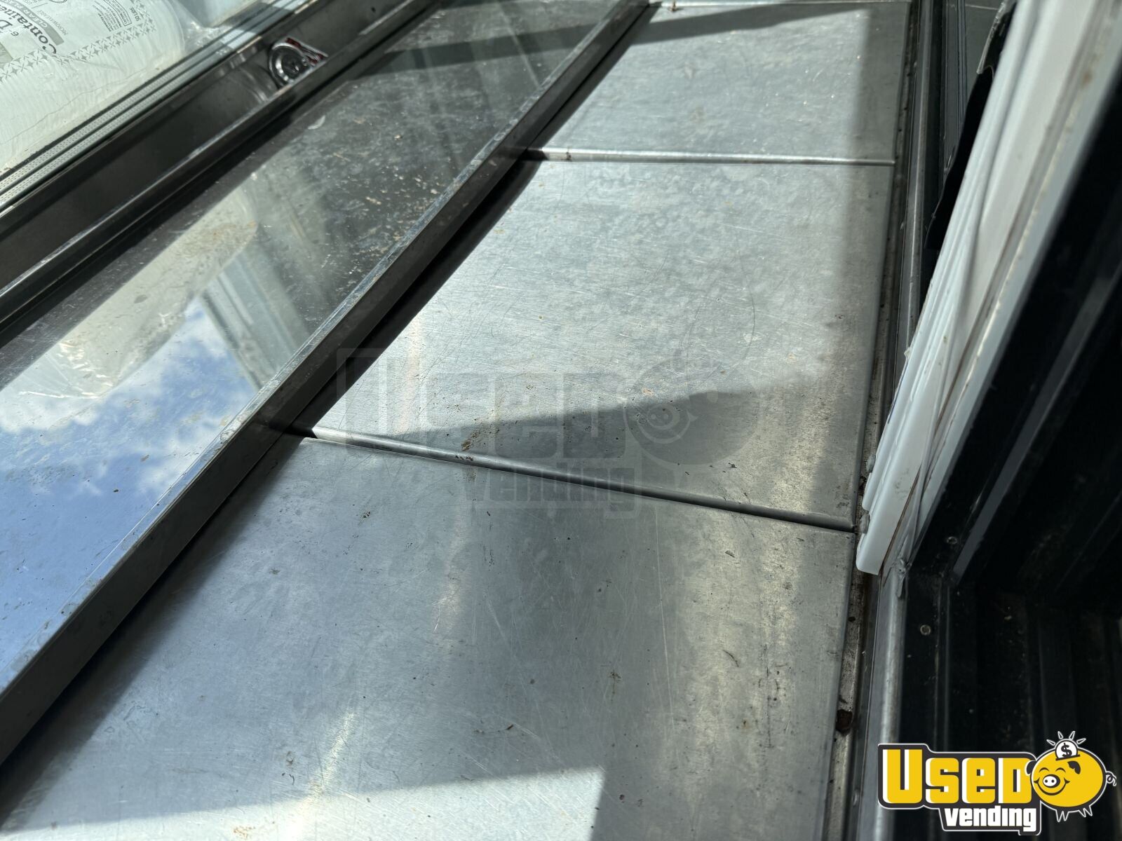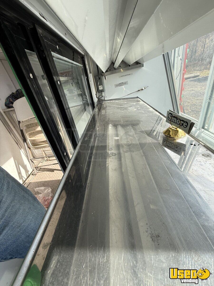 This 20-foot dessert trailer is equipped with two 7-foot refrigerated display cases with LED lighting and two 7-foot chest freezers. It features a large LED-lit marquee with approximately 300 lights and includes ample cabinet storage throughout.