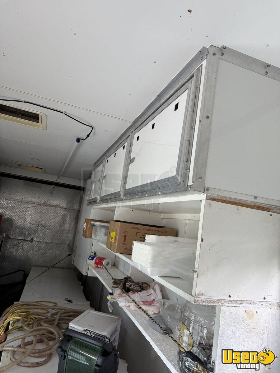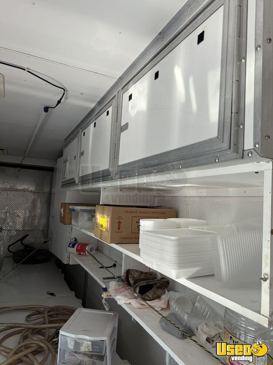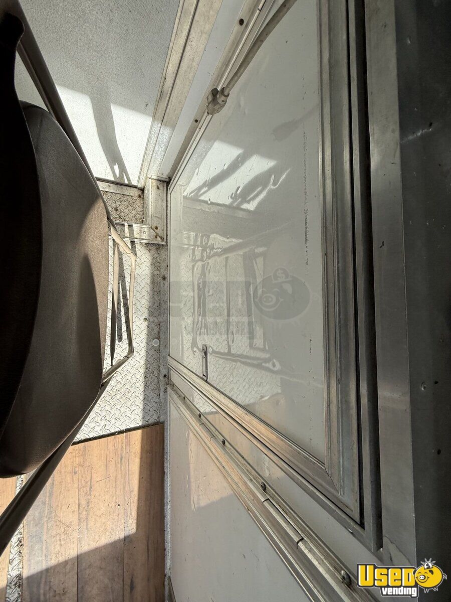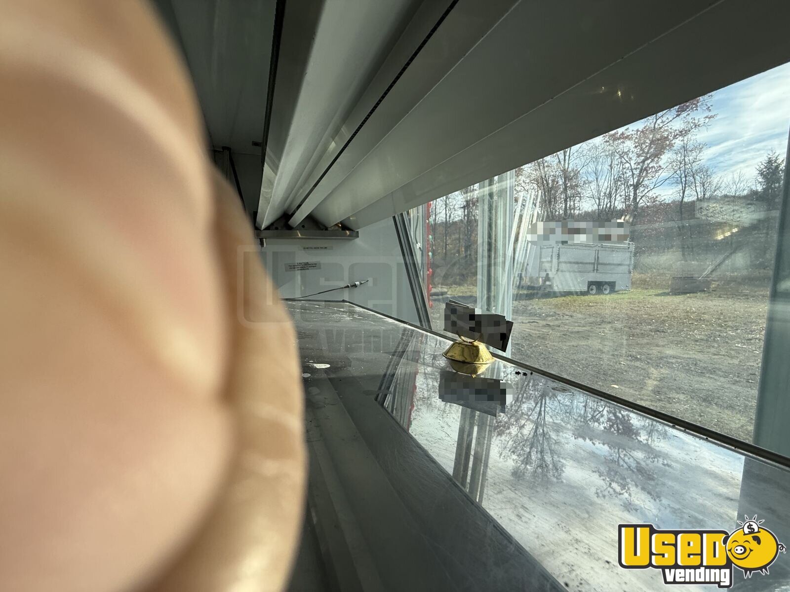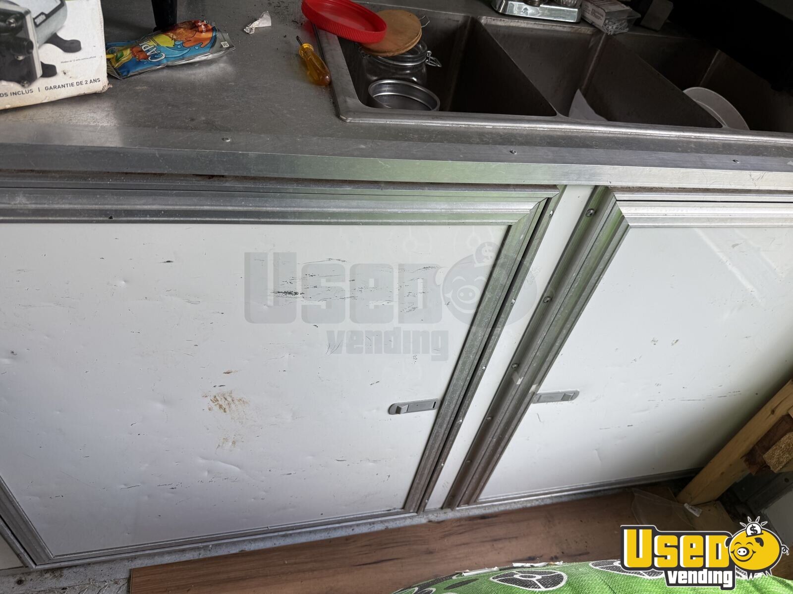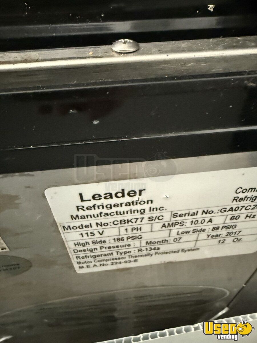 This 20-foot dessert trailer is equipped with two 7-foot refrigerated display cases with LED lighting and two 7-foot chest freezers. It features a large LED-lit marquee with approximately 300 lights and includes ample cabinet storage throughout.