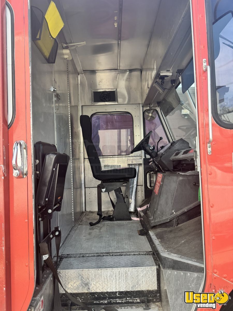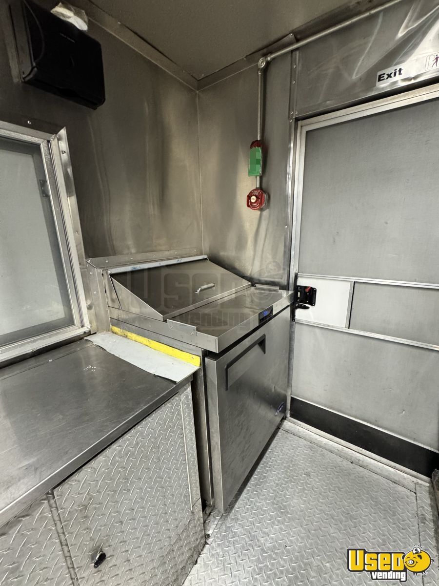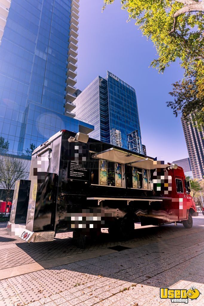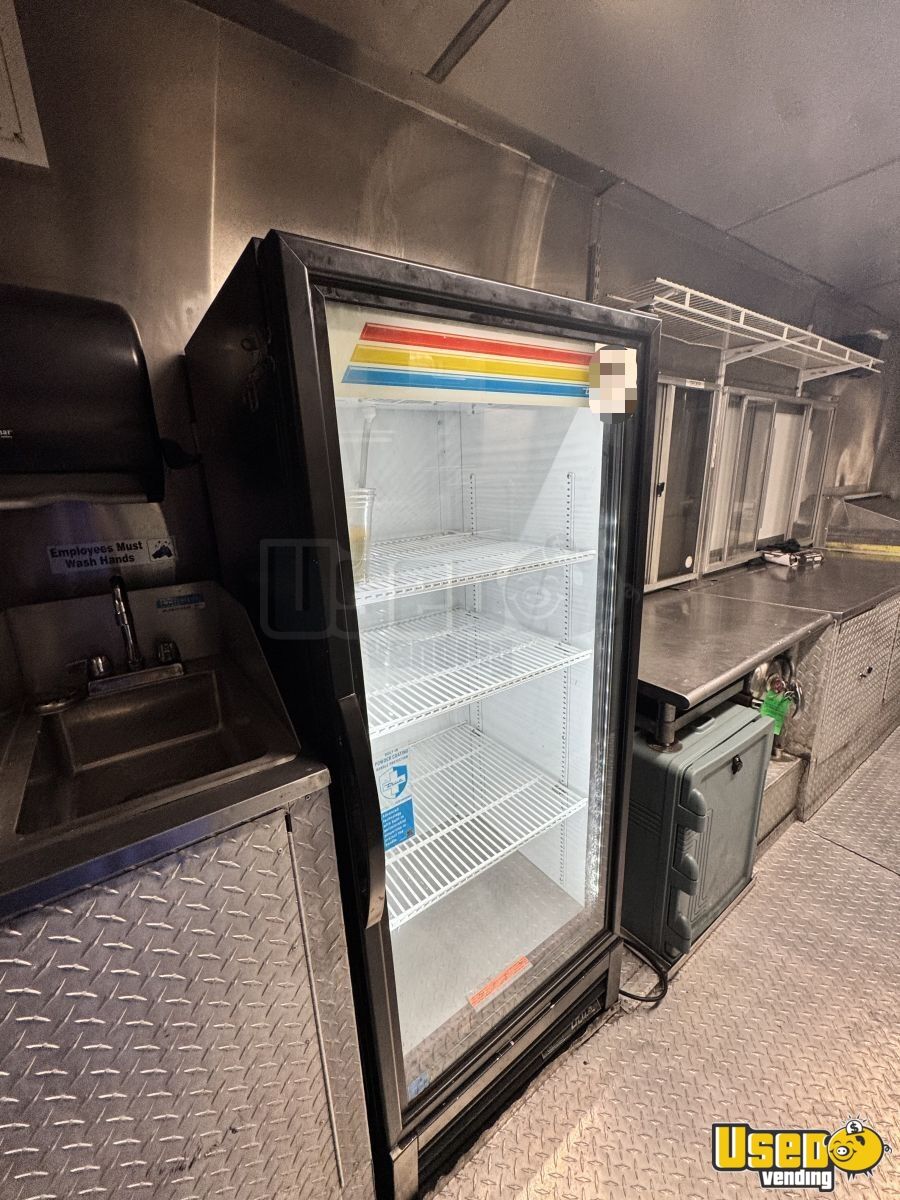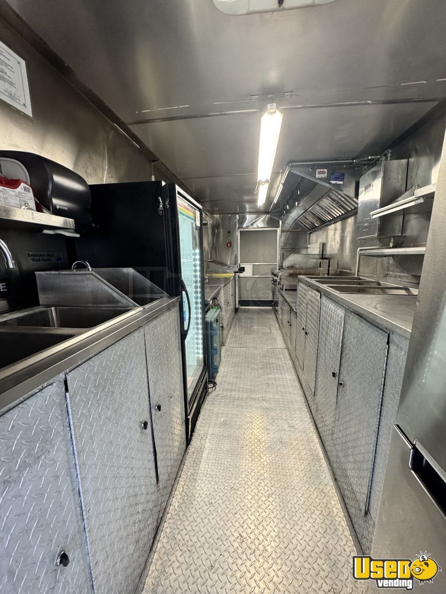 Key features include: - Full cooking line with stovetop, oven, flat grill, fryer, and steam table - Three refrigerators, including one with bottom freezer - Triple sink, hand-washing sink, and hot water system - Fire suppression system and stainless steel walls - Air conditioning, diamond-plated floor, and automatic transmission