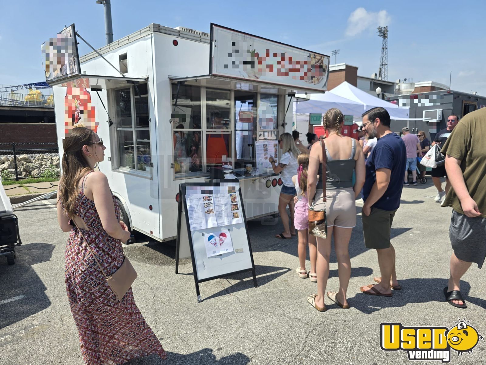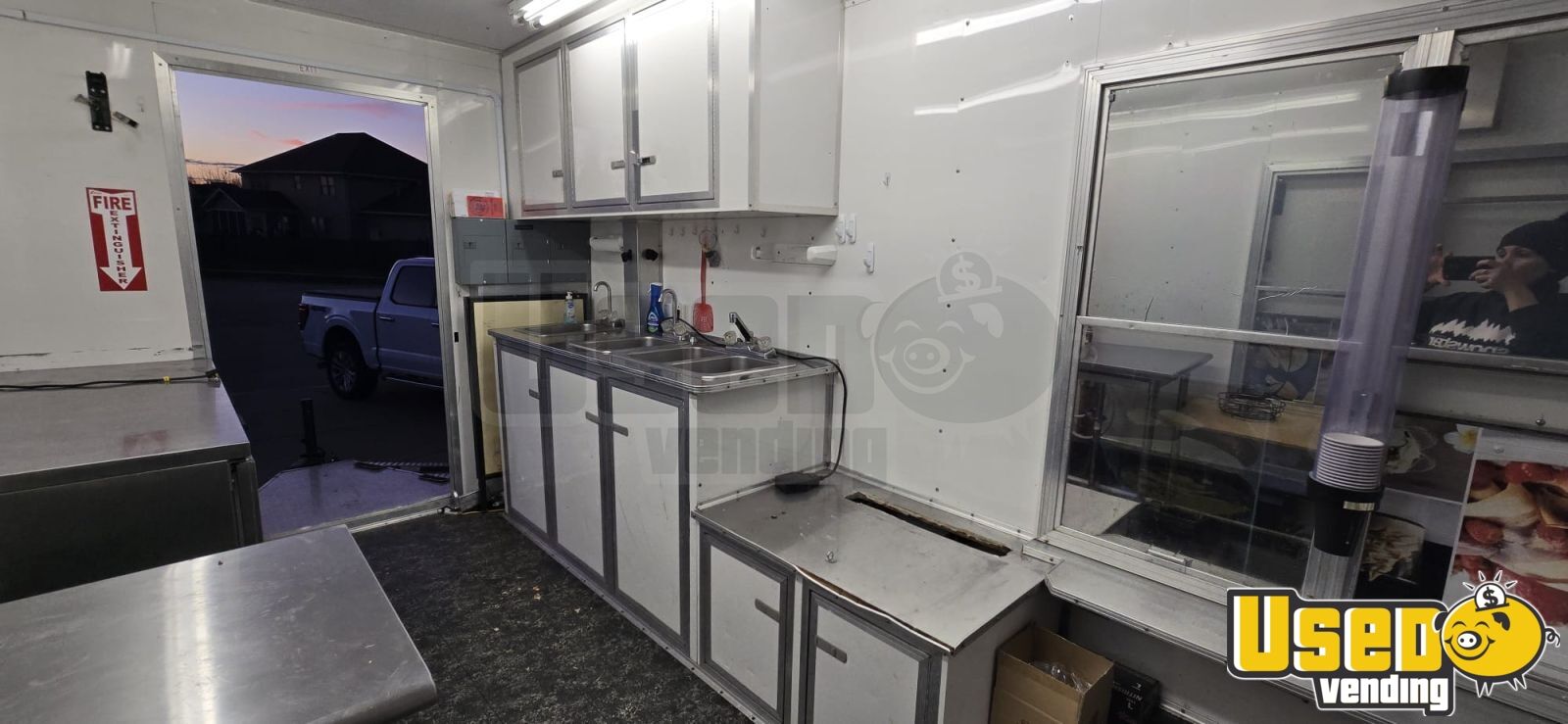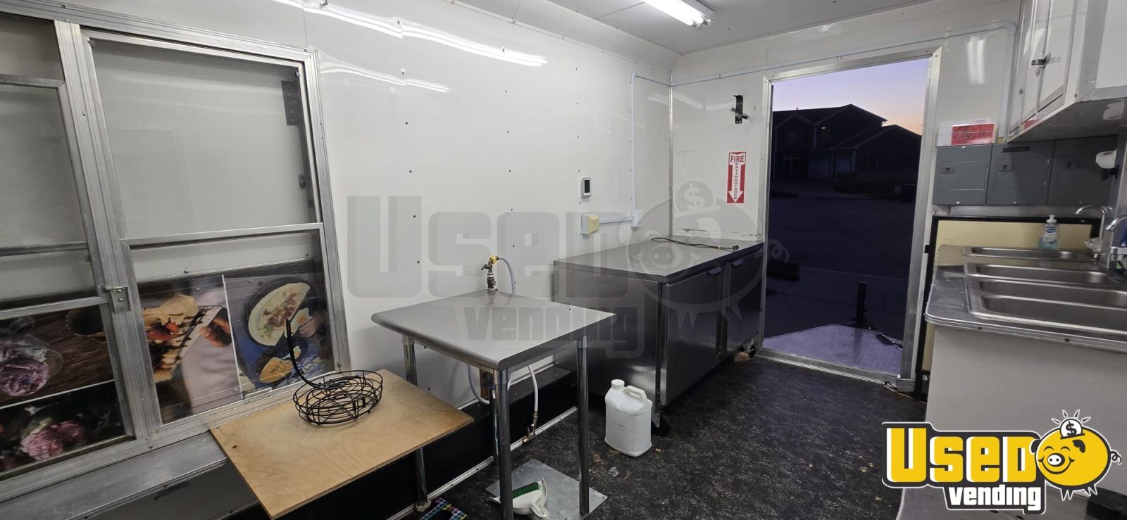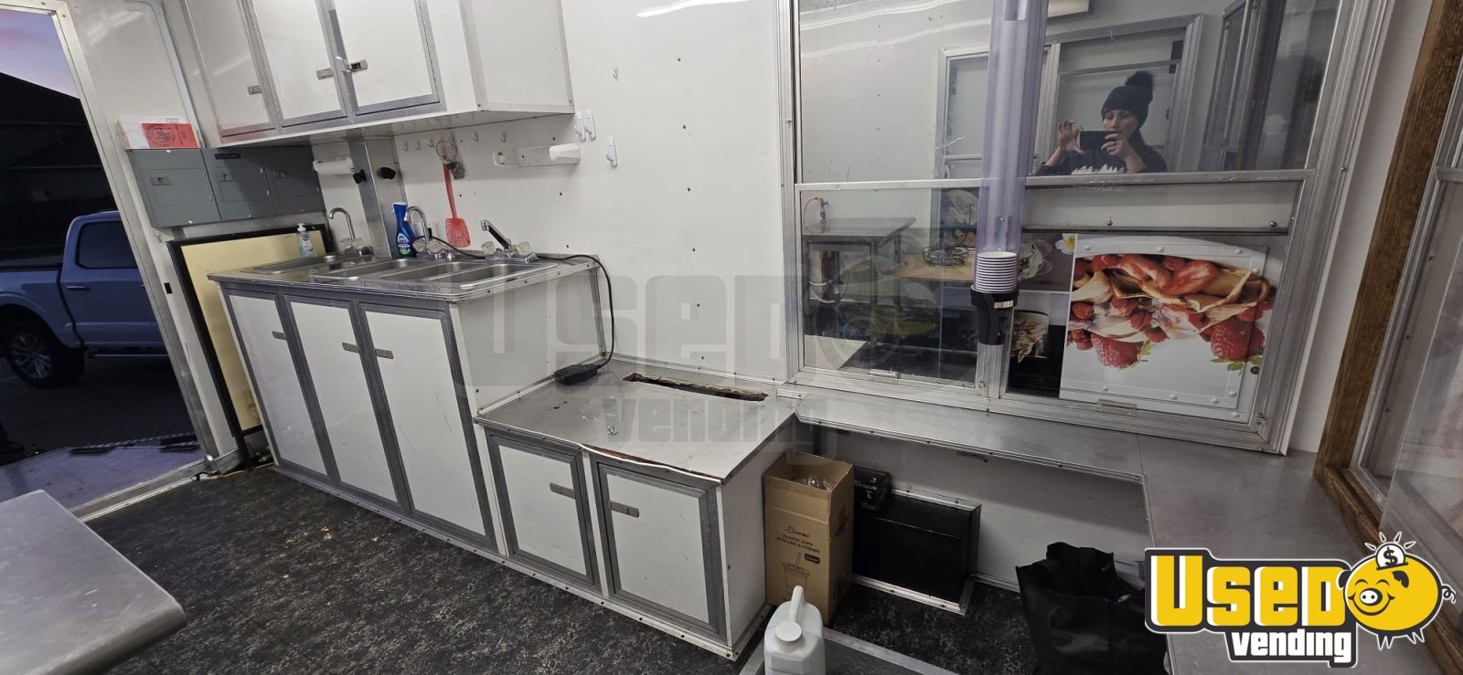 Though one front window cell was replaced with a net, the back door shows minor water wear, and two cabinet locks are missing, the trailer remains fully functional with new tires, fresh exterior wrap, and upgraded wiring and pump. Call today to learn more about this versatile mobile food unit.