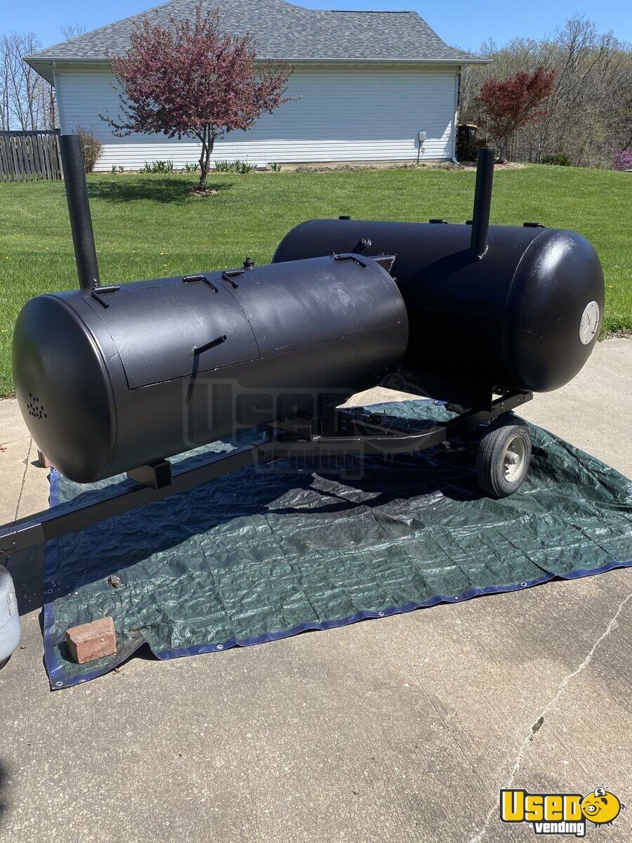 The tables have been removed, and new flooring is installed. The smoker is included; it is a trailer smoker made from two 6-foot propane tanks.