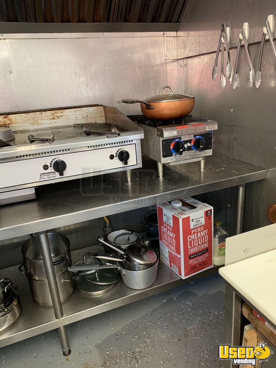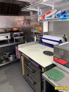 This unit is on a steel frame, and it has an aluminum outside and fiberglass walls, and ceiling, except around the cooking station which is stainless steel. Its kitchen was installed in 2015. It has an interior standing height of 7'.