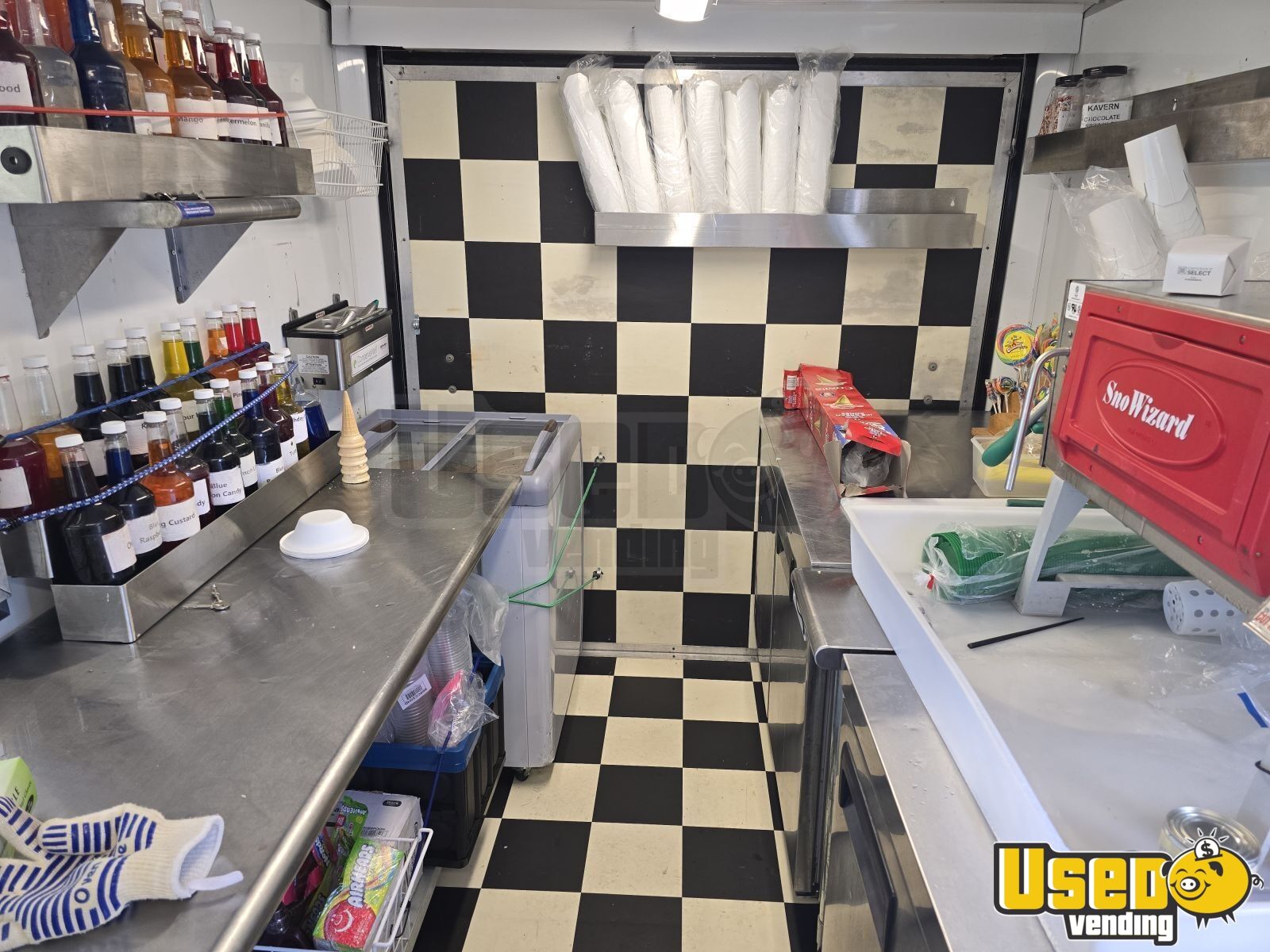 This shaved ice trailer is fully equipped and ready for operation. Outfitted for selling snoballs, ice cream, and lemonade, it includes multiple freezers and a complete plumbing setup. Previously licensed and in excellent working order. Don't miss out, call us now!