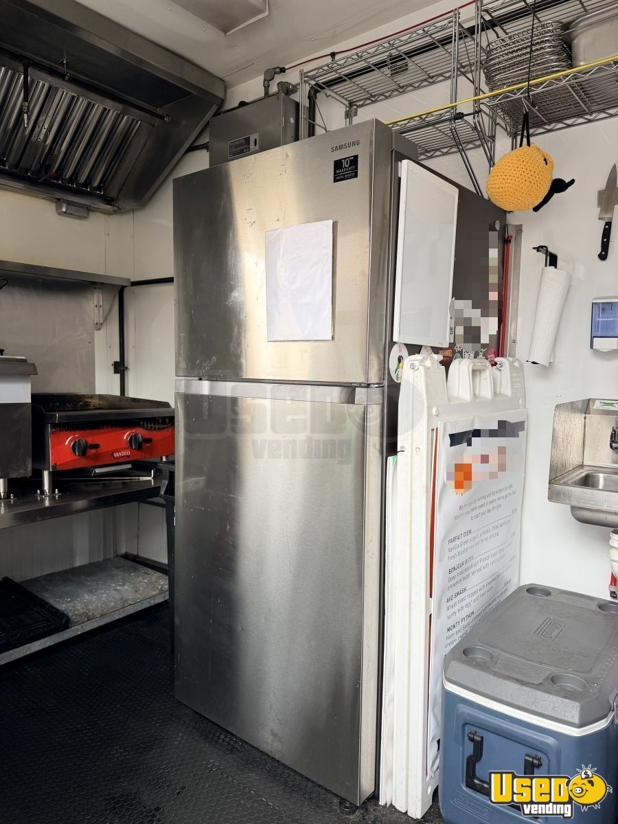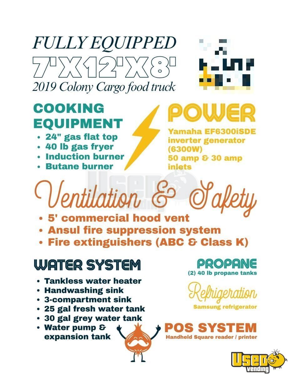 Standout features include: - 5' exhaust hood with Ansul fire suppression - 3' flat grill and 40lb fryer - Samsung refrigerator/freezer - Propane system with dual 40lb tanks - Yamaha 6300W inverter generator - Tankless water heater and butane burner - Insulated walls, floor drain, and fold-down customer counter