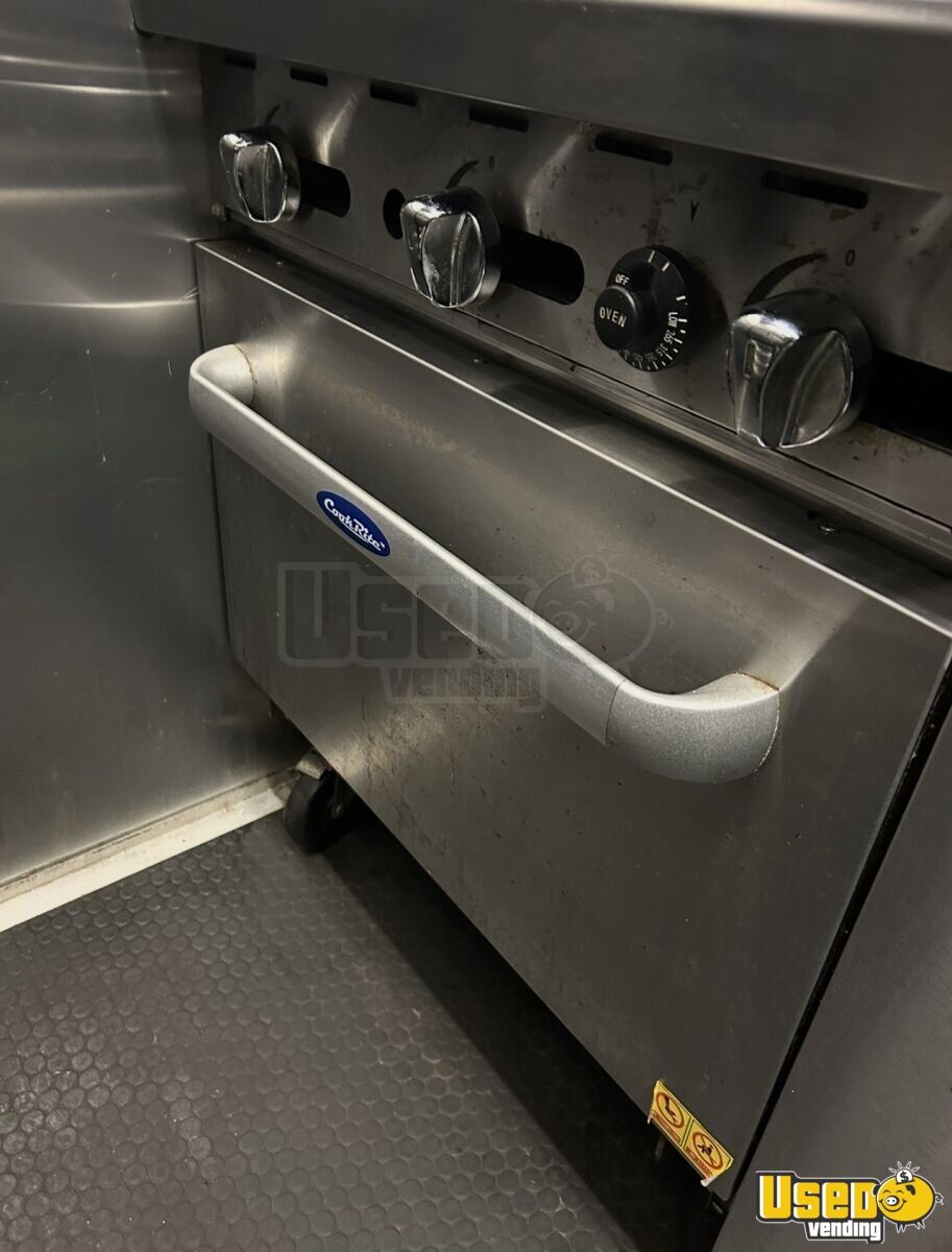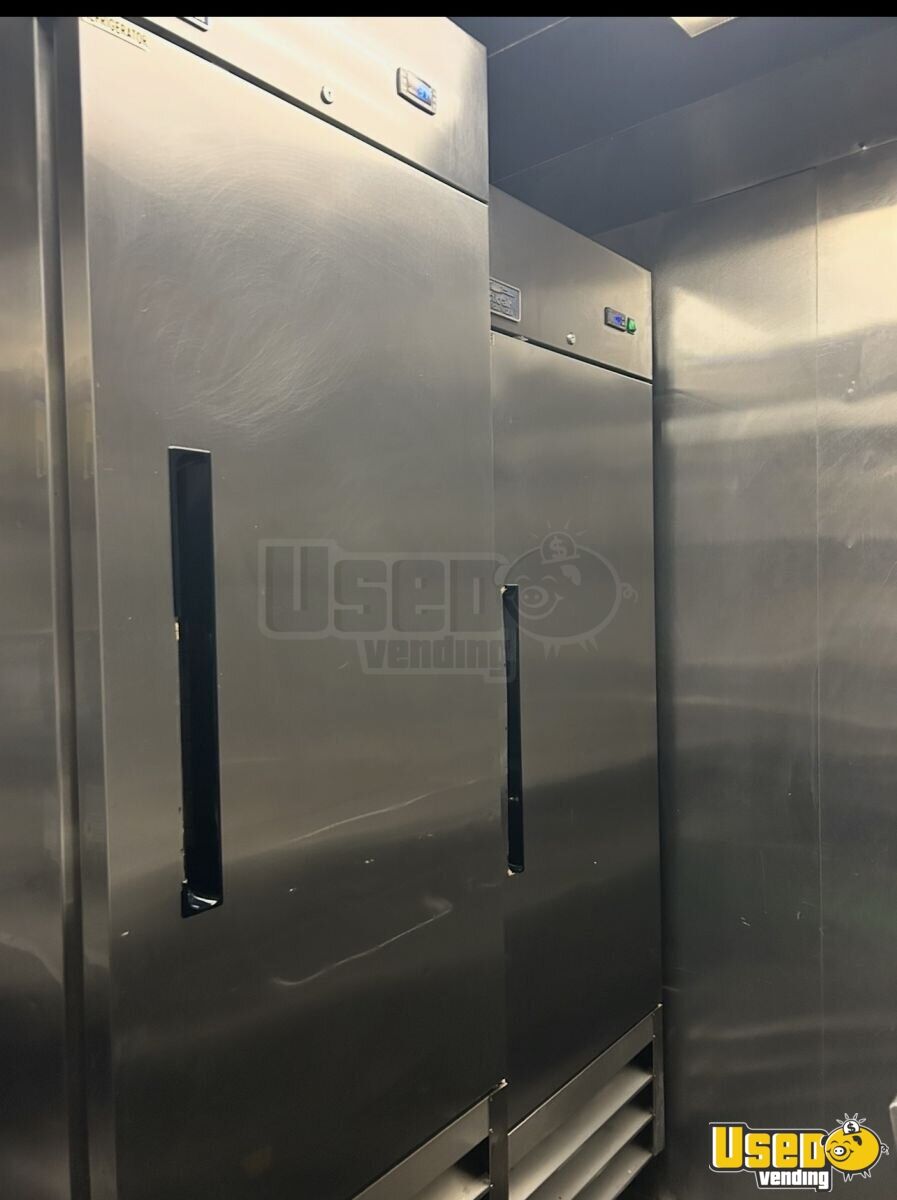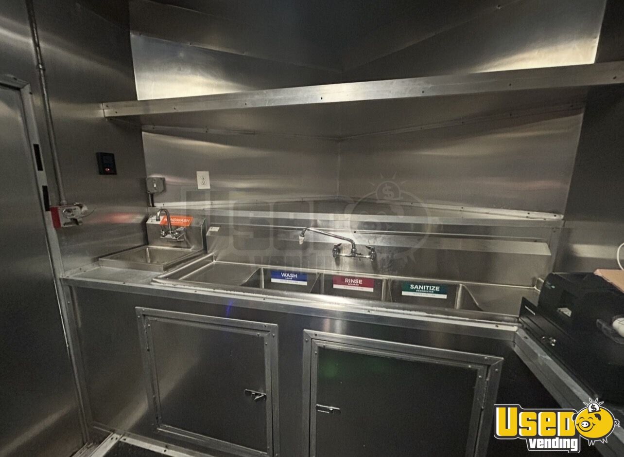 Standout features include: - 36" flat-top griddle, full oven, and 2-burner stove - Full-size refrigerator, upright freezer, and 60" prep station - Triple sink with separate hand sink and hot water system - 7-ft exhaust hood with fire suppression system - Air conditioning and interior/exterior lighting - Dual 100-lb propane tanks with secure rear cage - Spacious 6-ft serving window and backup camera