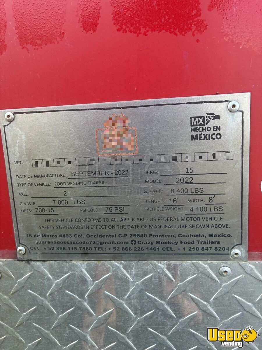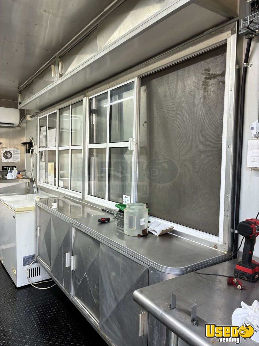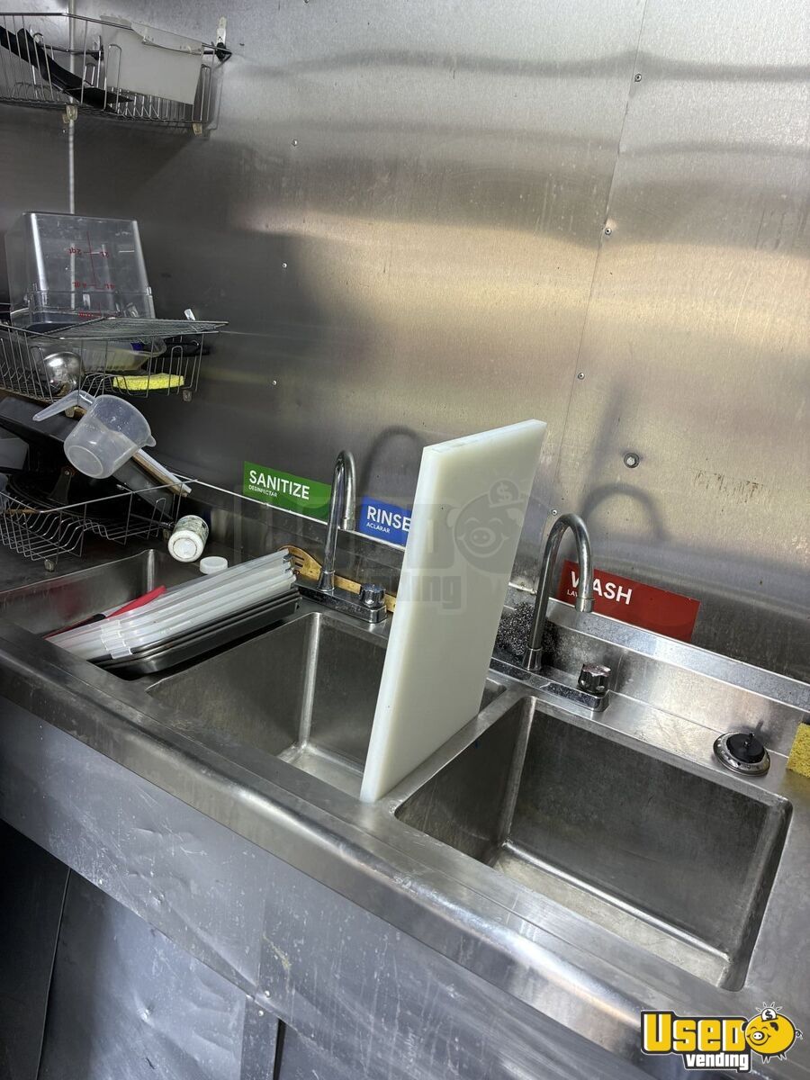 Outstanding features include: - A/C and fire suppression system - Large propane tank - Full refrigerator and cold prep station - Small fryer, three-burner flat grill, two-burner stove - Triple sinks with gray water tank - Exhaust hood, lighting, and breaker panel