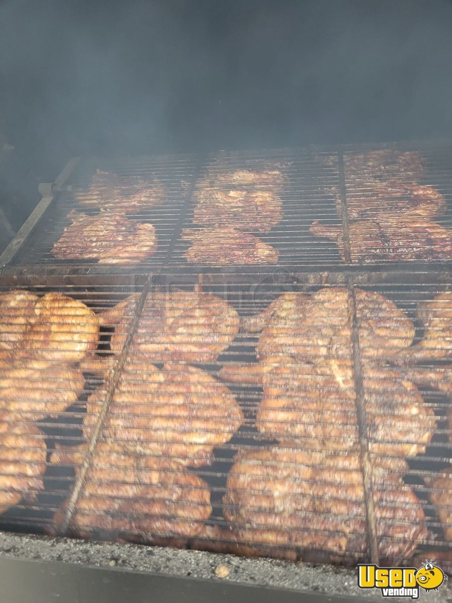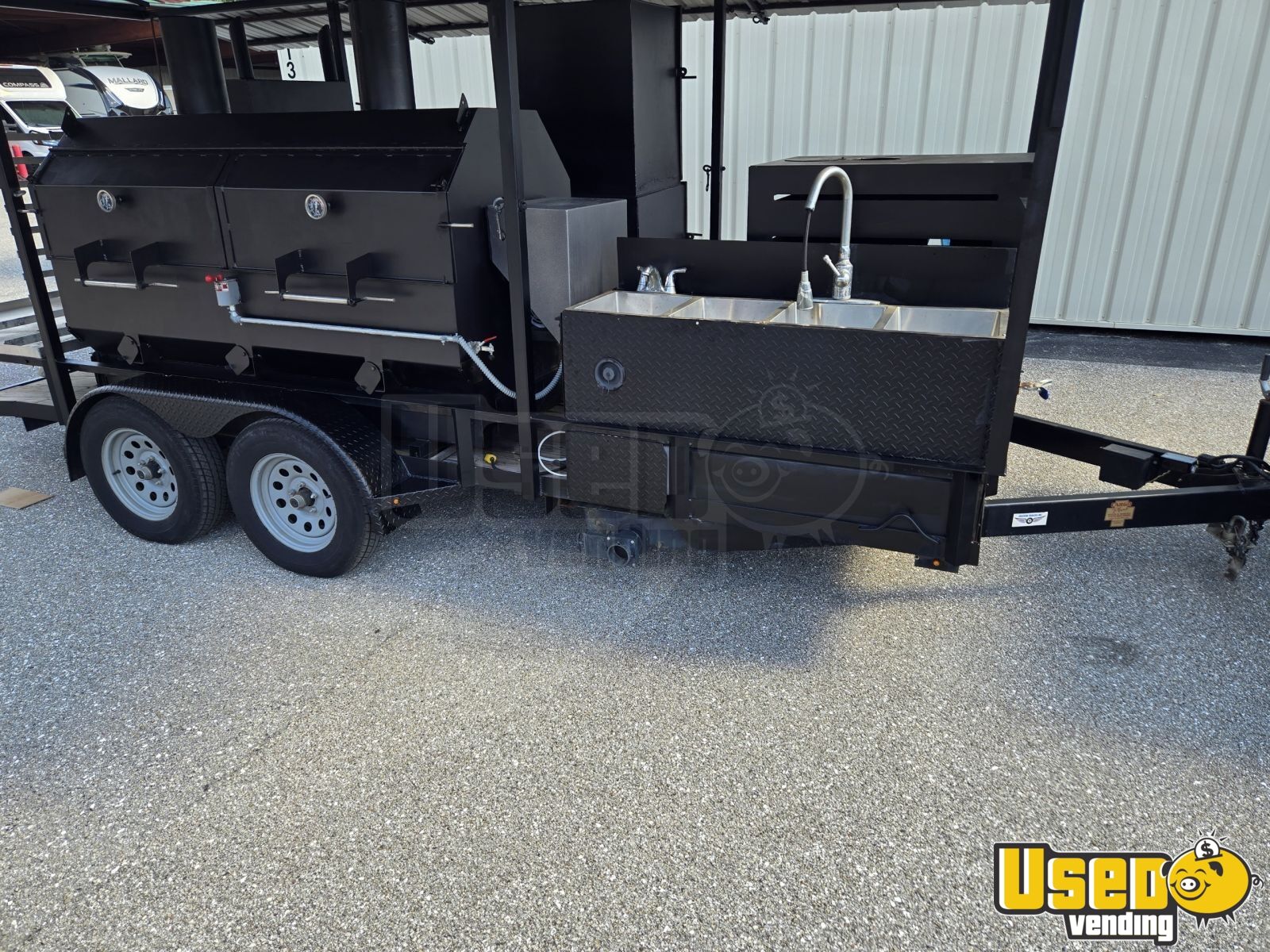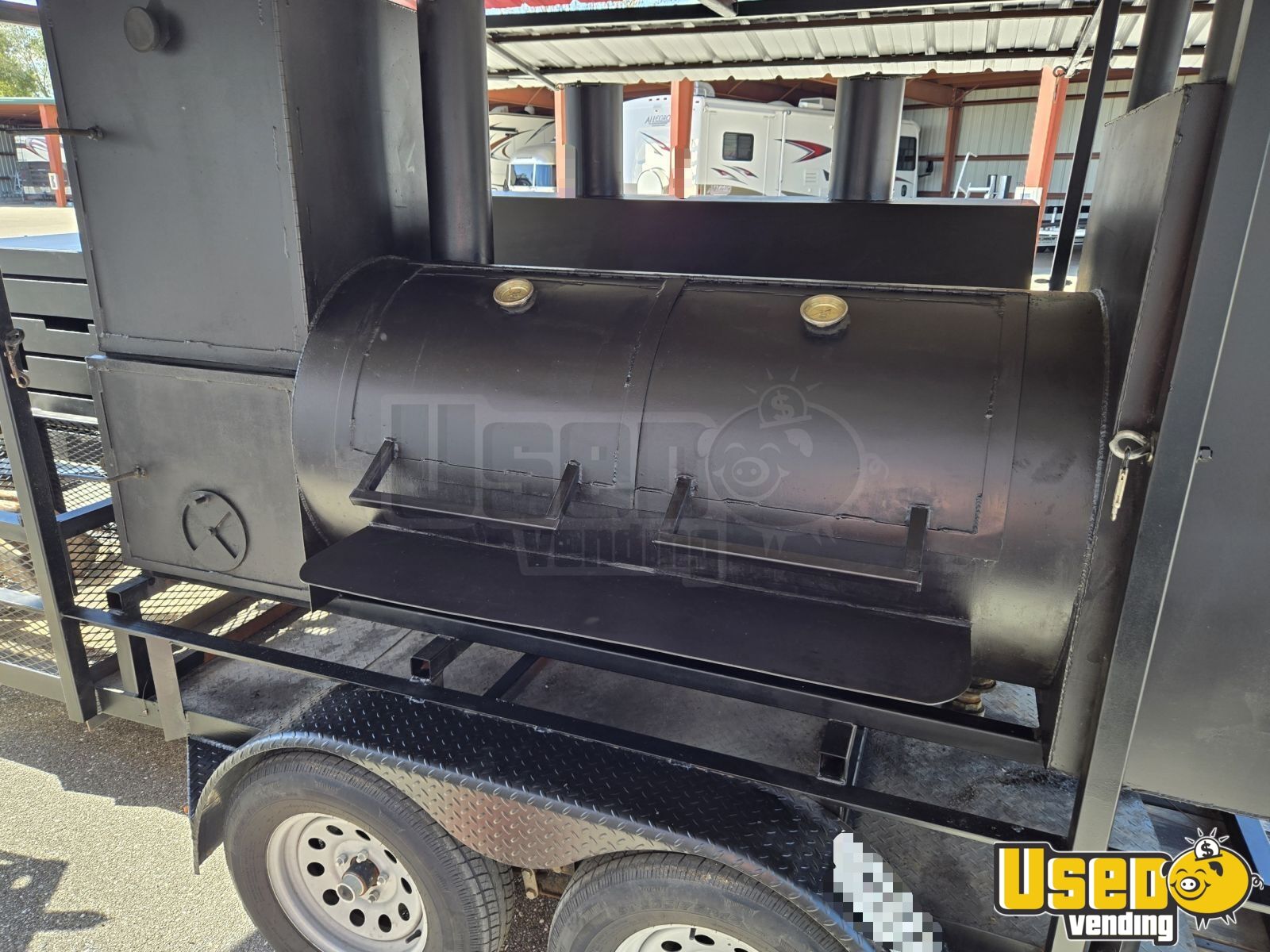 - Dual custom pit and Wellspring rotisserie reverse flow smokers