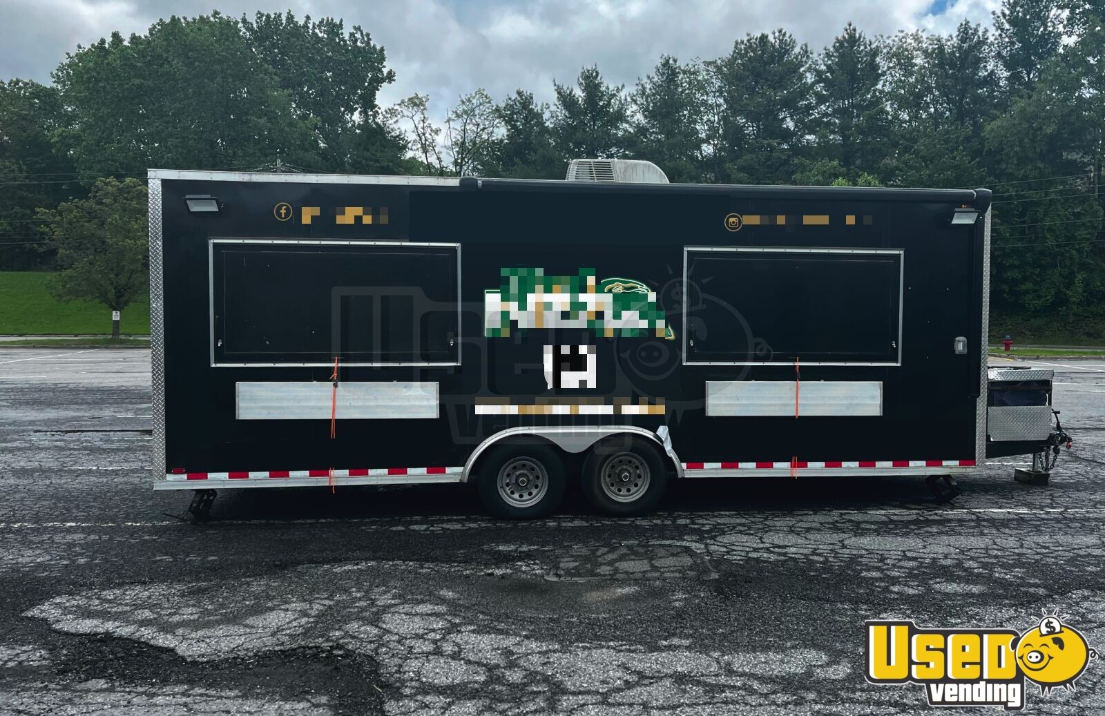 Standout features include: - Peerless four-deck gas pizza oven - Beverage-Air 67" prep table - Turbo Air refrigeration and freezer units - Dual 100# propane tanks and Honda 7700W generator - Stainless steel interior and cabinetry - Dual concession windows with fold-down counters - 14-ft vinyl patio awning with LED lighting
