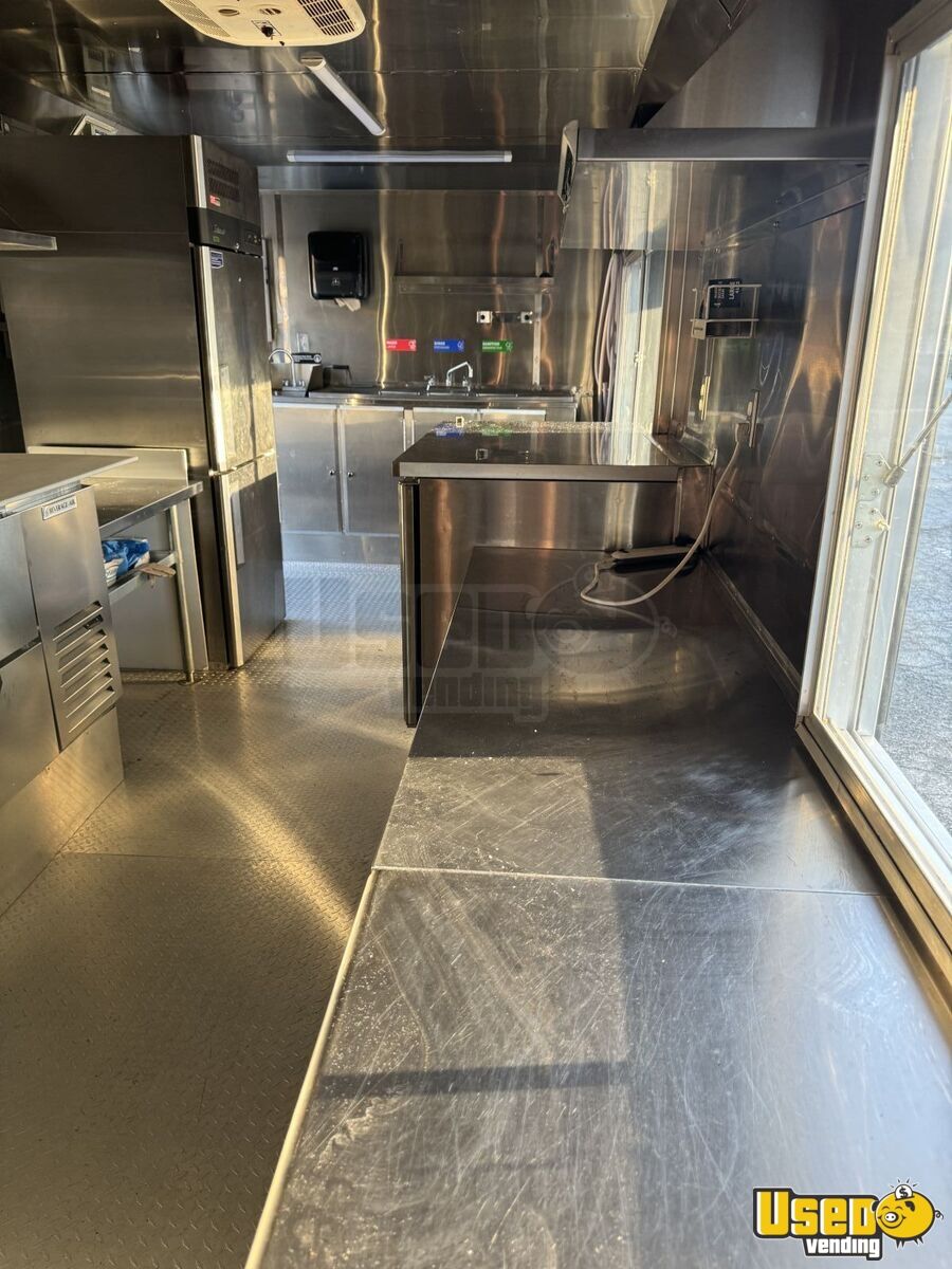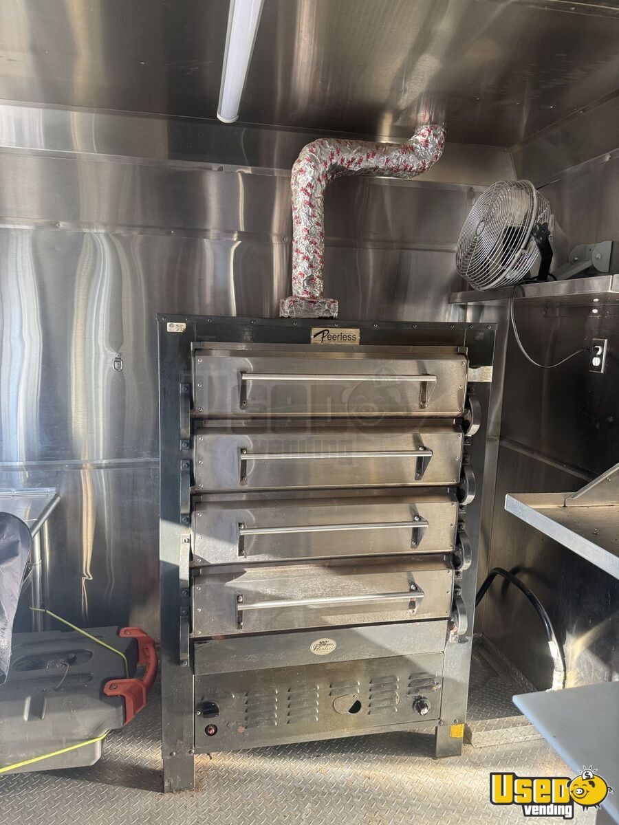 Standout features include: - Peerless four-deck gas pizza oven - Beverage-Air 67" prep table - Turbo Air refrigeration and freezer units - Dual 100# propane tanks and Honda 7700W generator - Stainless steel interior and cabinetry - Dual concession windows with fold-down counters - 14-ft vinyl patio awning with LED lighting