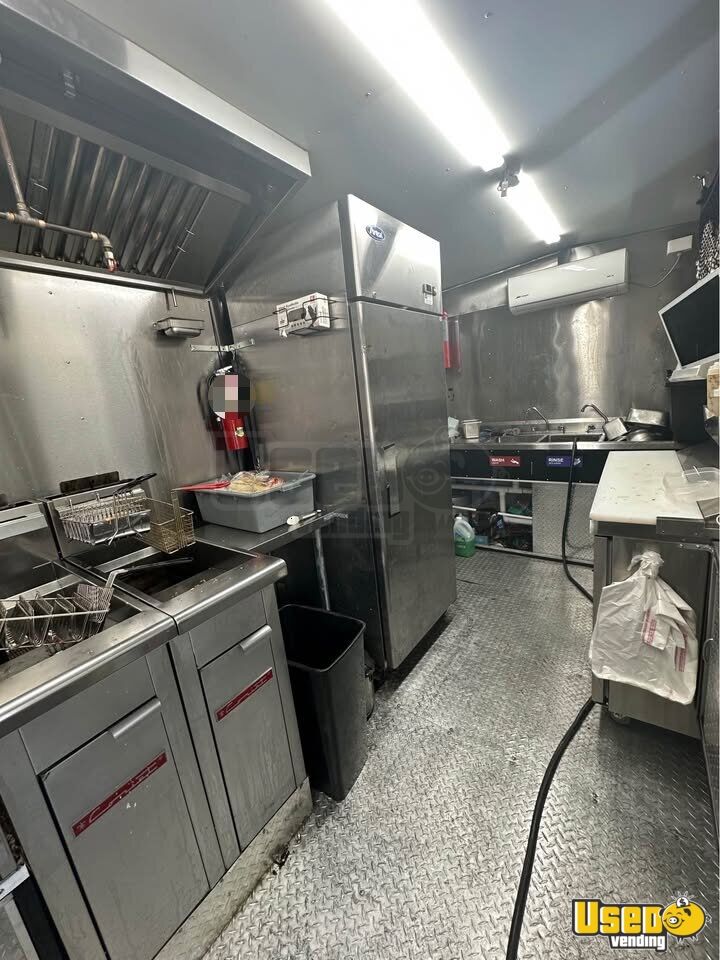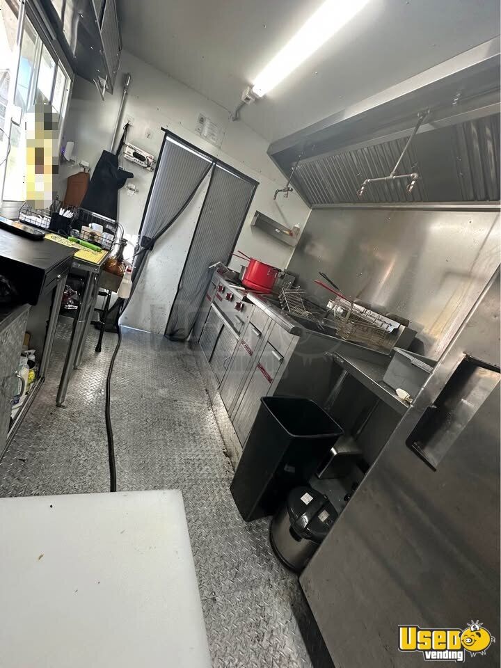 Standout features include: - Air conditioning and concession window - Tall refrigerator and two-door prep table - Three fryers and 36” flat top grill - Exhaust hood with fire suppression system - POS system and full plumbing setup - Lacks CA insignia