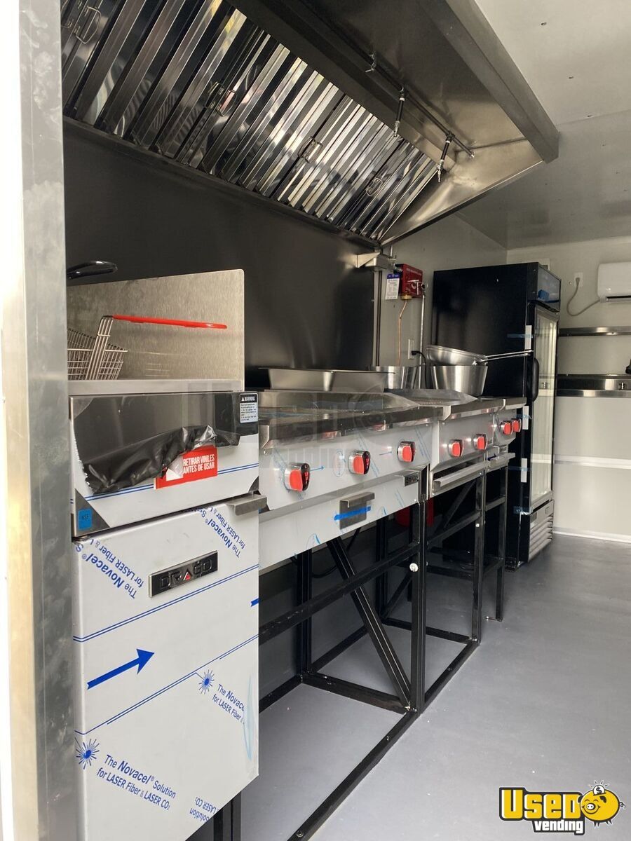 Standout features include: - Air conditioning unit - Concession window with exterior counter and awning - Dual propane tanks - Full cooking line: stovetop, grill, flat griddle, fryer - Refrigeration and prep cooler - Triple sink, hand-wash sink, and hot water system - Commercial exhaust fan with fire suppression system