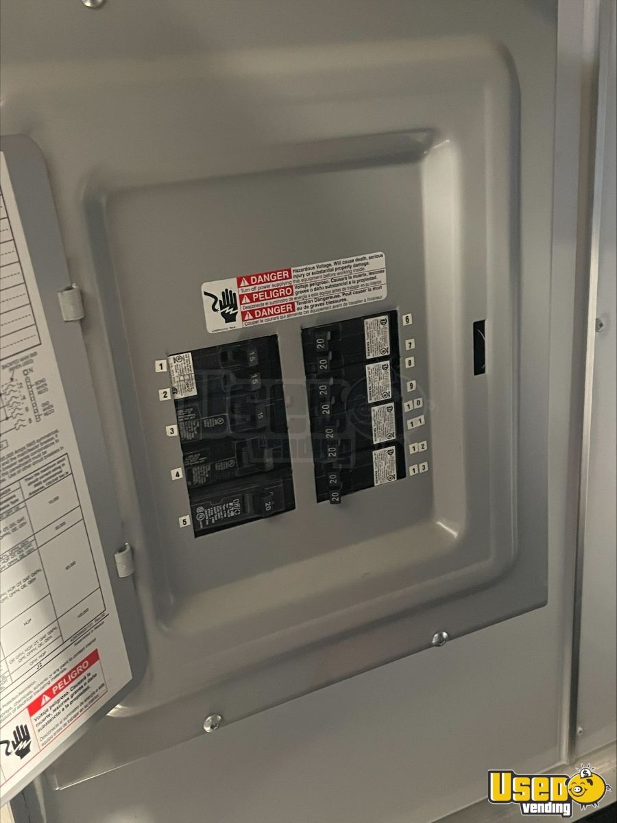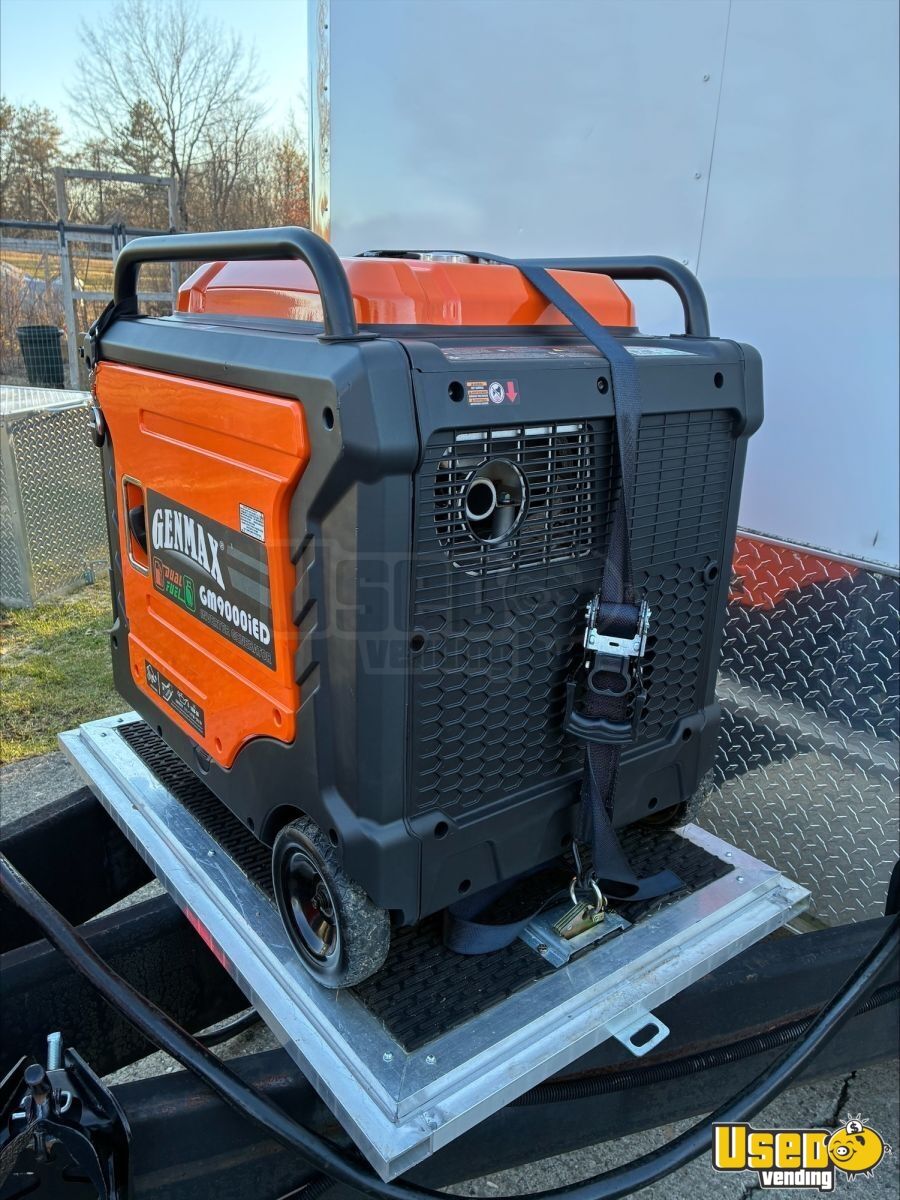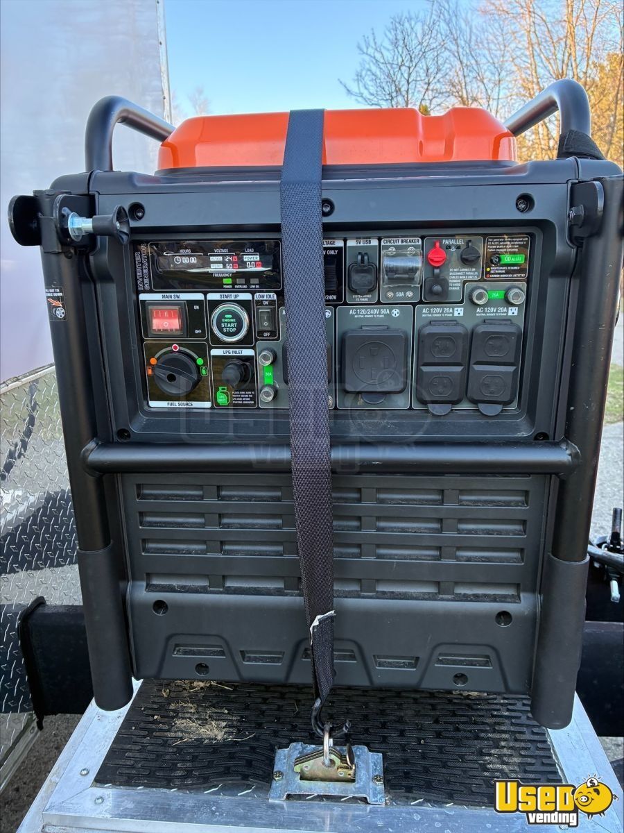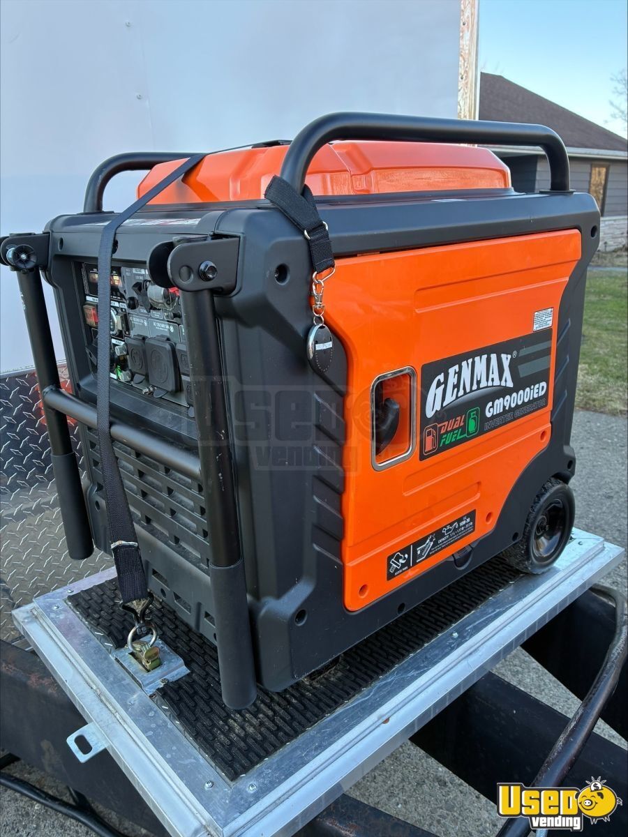 - 9000-watt GenMax dual-fuel quiet generator- 7 ft ceiling height with full insulation- 13,500 BTU roof A/C and LED lighting- True T-19GLH refrigerator and dual Bunn brewers with grinder- Double sink, 42-gallon freshwater, and 52-gallon gray water tanks- Ample cabinetry, outlets, and upgraded 100AMP breaker panel