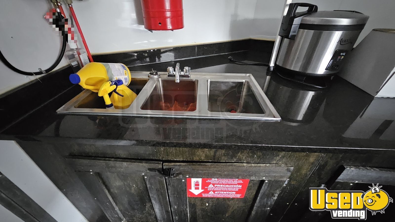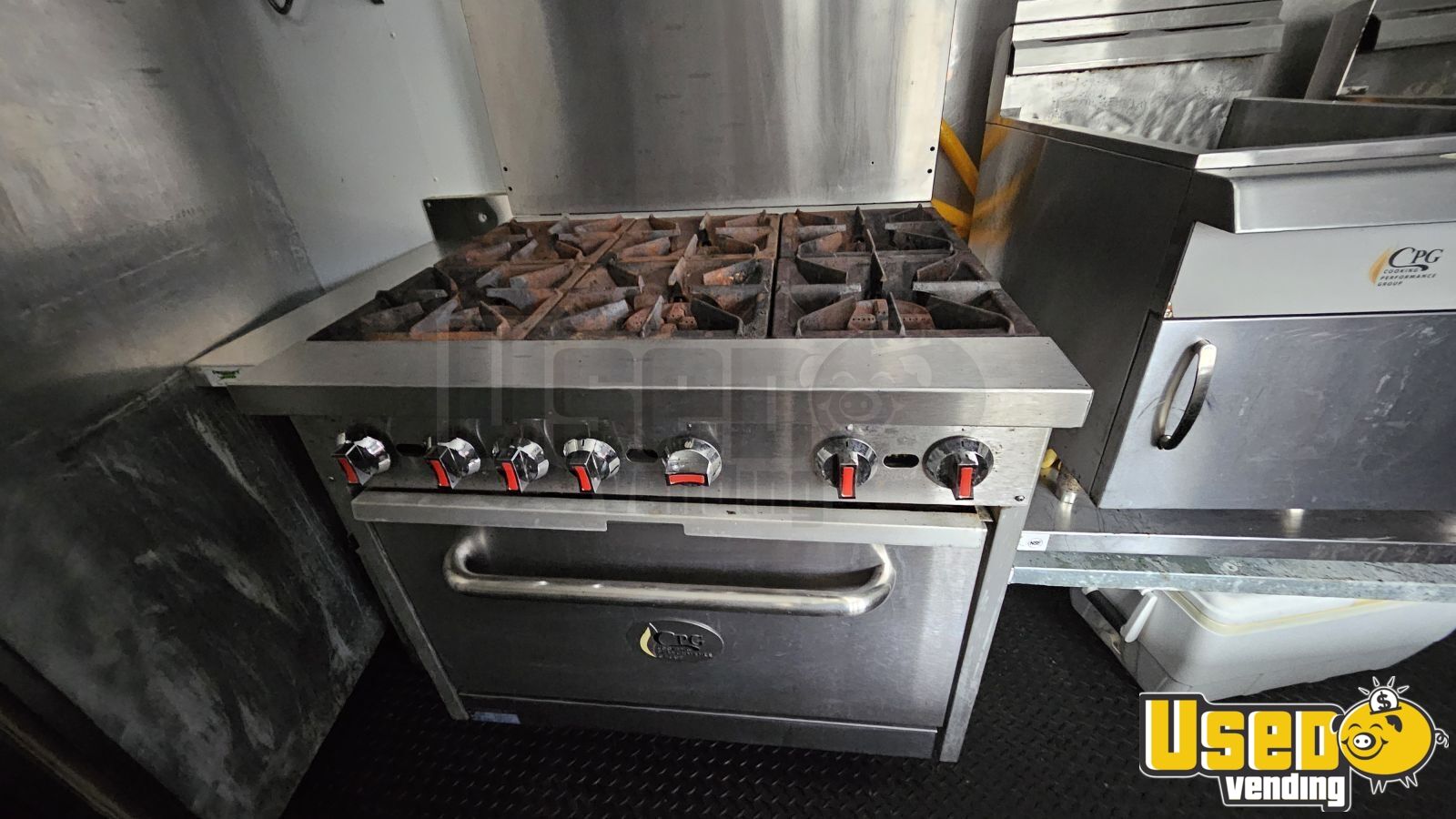 Key highlights include: - 8 ft ventilation hood with fire suppression system - Dual sink setup - 6-burner propane range with oven - Two propane fryers - Warming/proofing cabinet - 28" refrigerator - HVAC system for heating and cooling - Stainless steel prep tables - Dual sous vide food warmers - Dual-fuel generator and four 100lb propane tanks