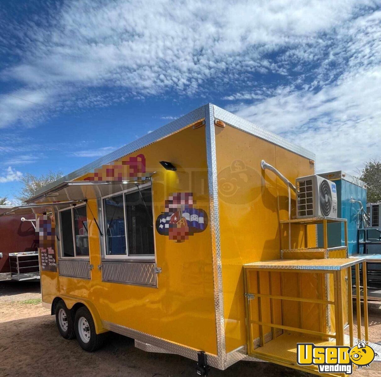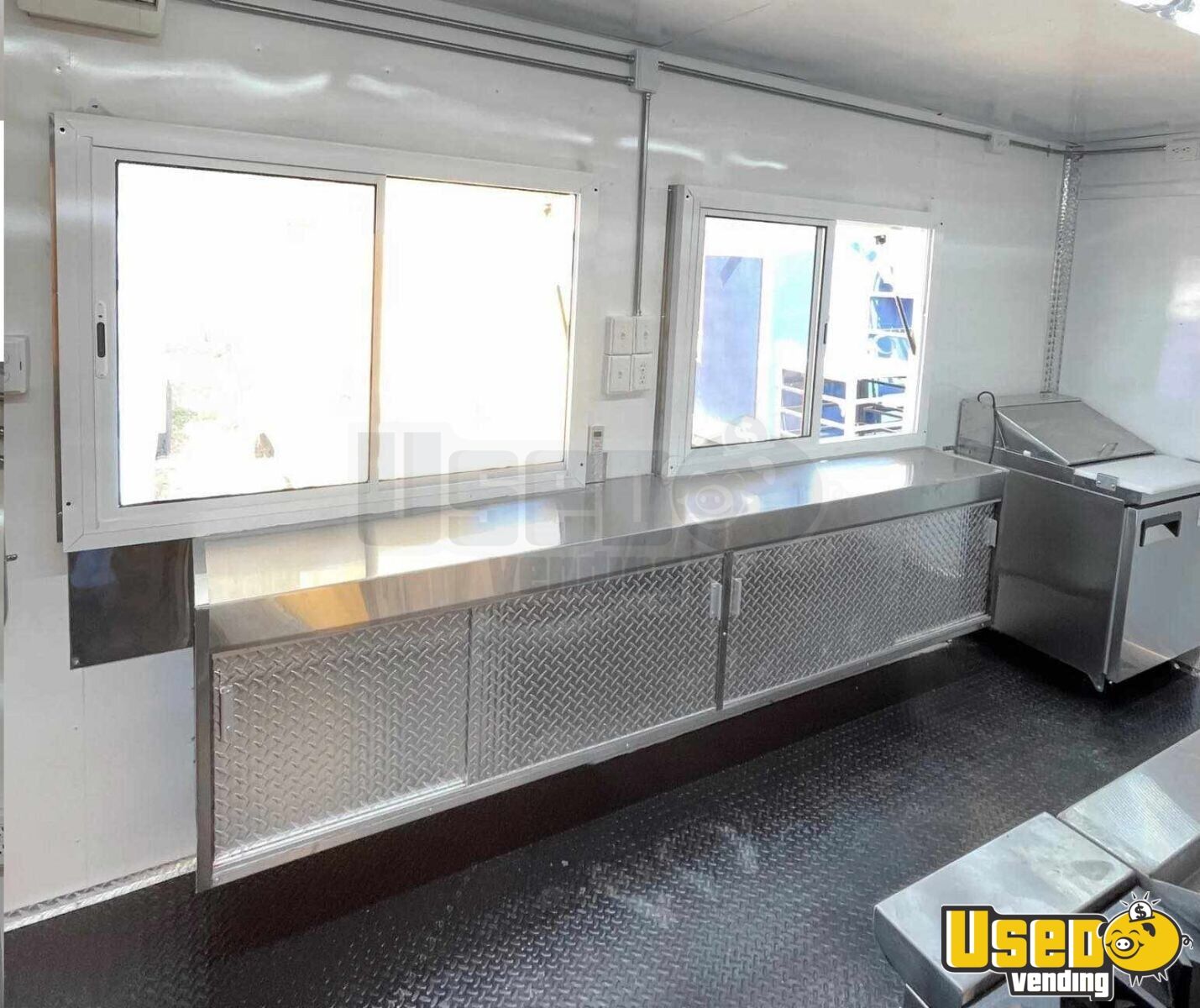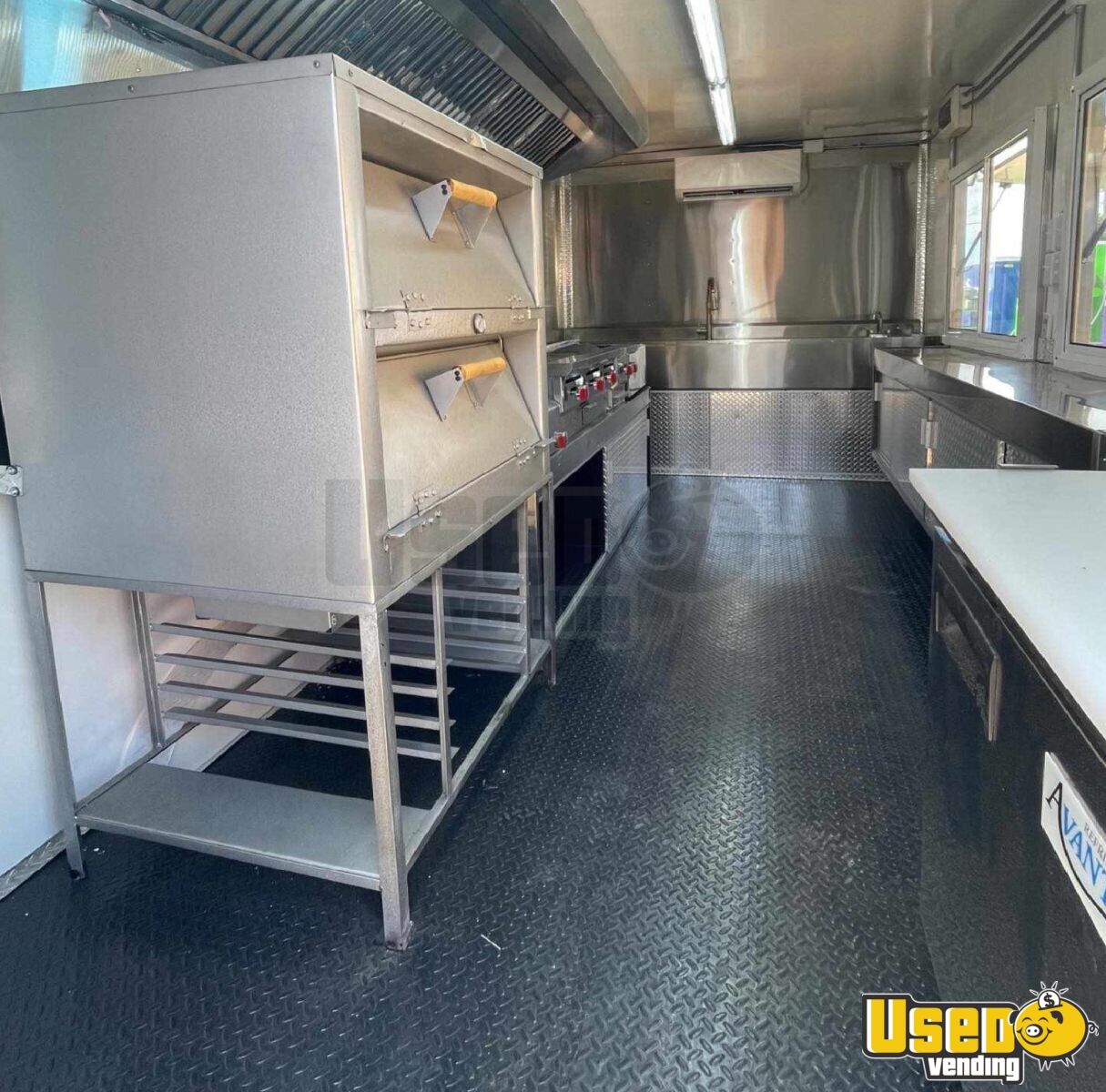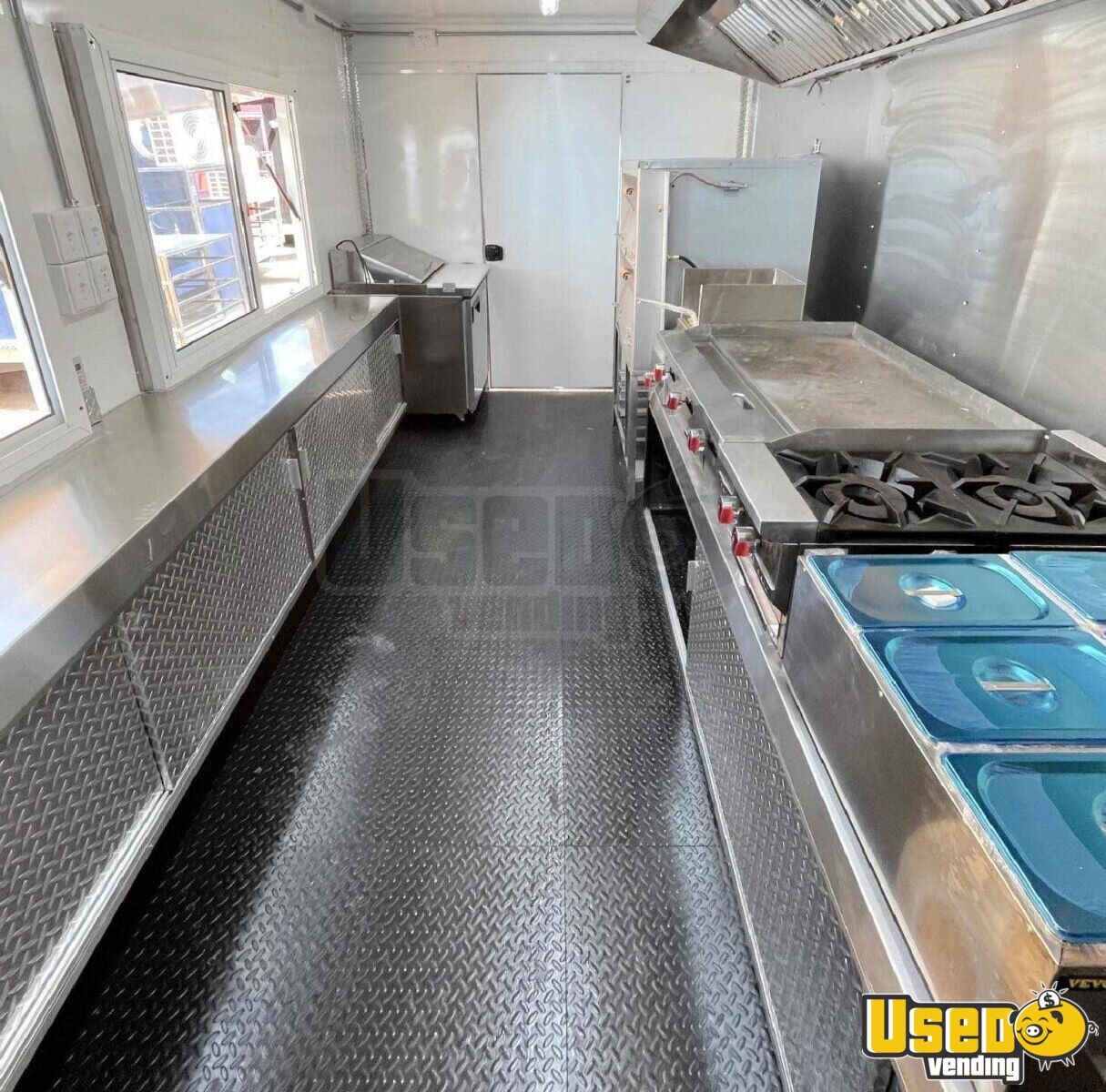 Standout attributes include: - Two concession windows with fold-down counters - Bright visible exterior with enclosed propane and generator cages - Four-rack oven, 48” flat top, fryer, burners, and steamer tables - Upright fridge/freezer plus 6-compartment prep cooler - Fire suppression system with 7’8’’ vent hood - Triple sink, hand-washing station, and hot water setup - Climate control with mini split AC/heat - Ample storage and stainless-steel interior finishes