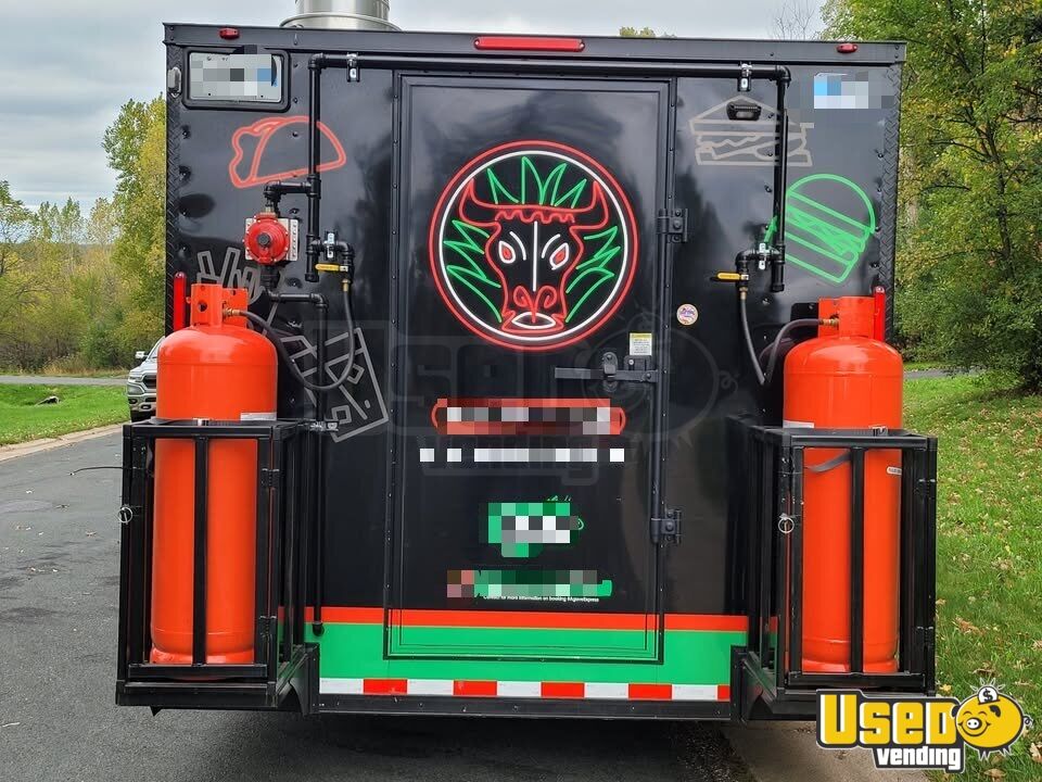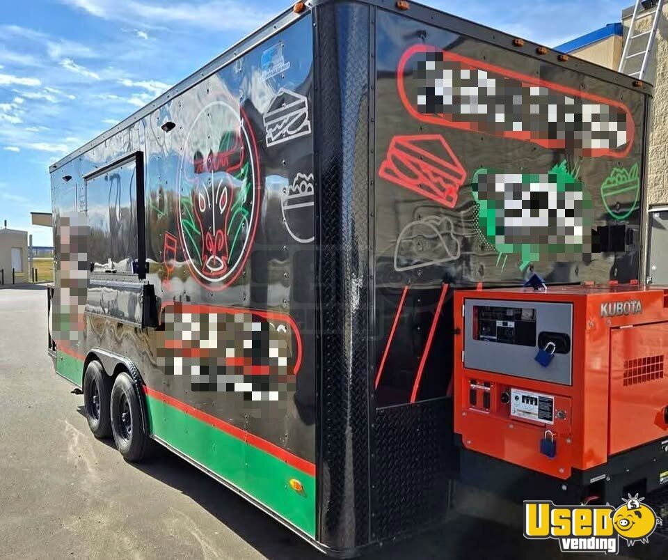 The 2024 Freedom Food Trailer offers a sleek black exterior with a clean grey interior, designed for efficiency and style. Sized at 8.5' x 18', this used kitchen trailer is powered by a reliable Kubota GL14000 generator—perfect for mobile food operations on the go.