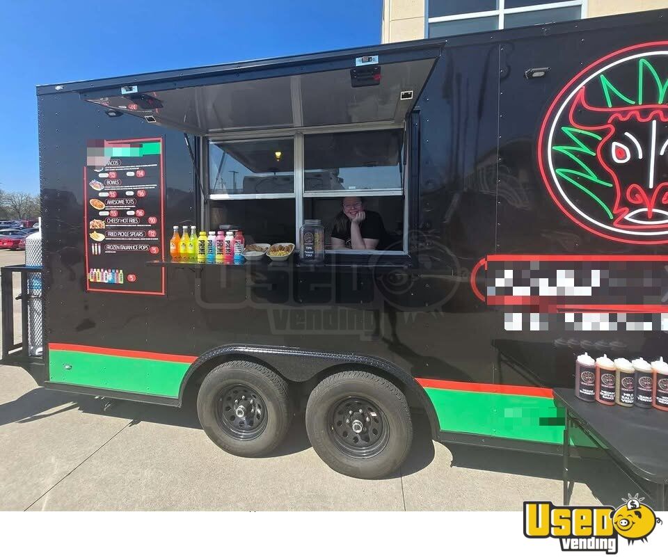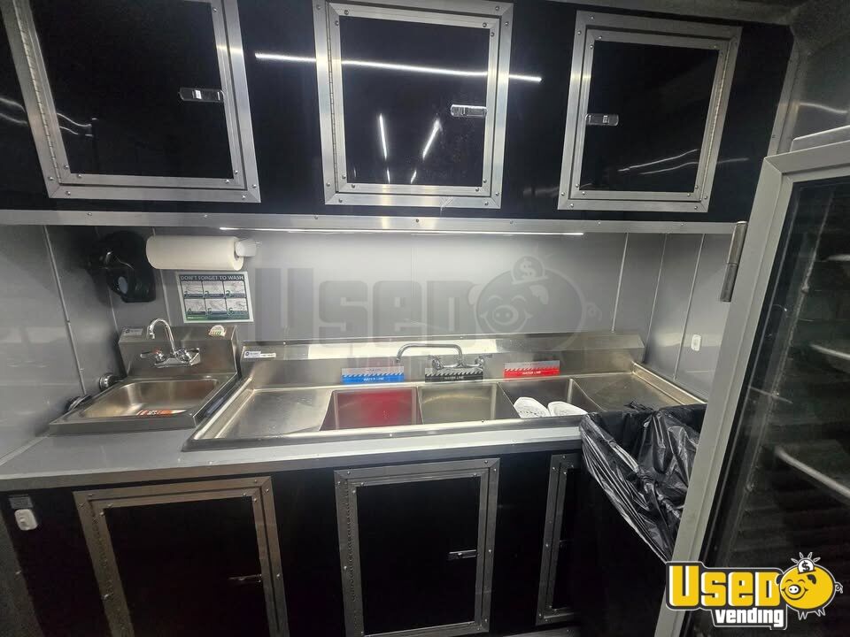 Standout features include: - Concession windows - Built-in cabinets - Upright freezer, refrigerator, and prep cooler - Fryers and food warmer - Exhaust hood and fire suppression system - Interior lighting, outlets, and triple sinks