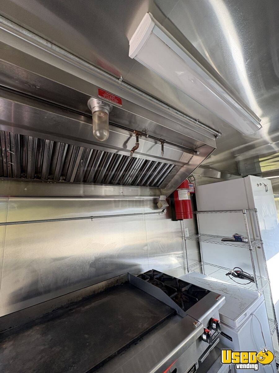 Notable highlights include: - Commercial hood with ventilation system - Flat-top griddle, fryer, and dual burners - Upright refrigerator and freezers - Air conditioning and insulated walls - Triple sink and hand-washing station - Fire suppression system and propane setup