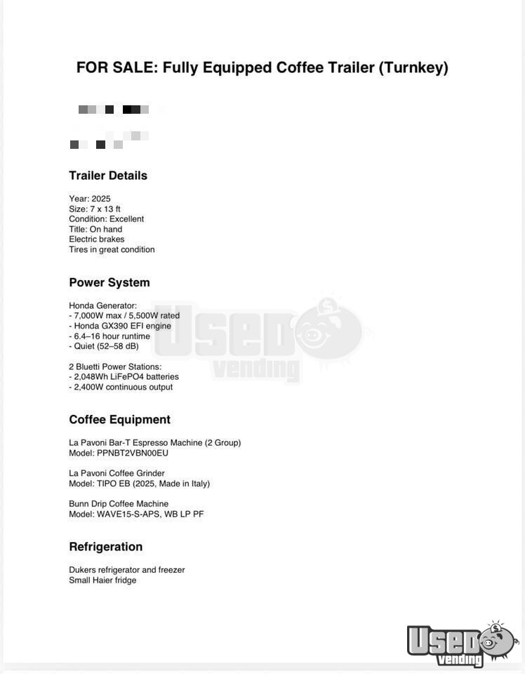 This 2025 mobile coffee trailer offers a near-new, turnkey setup perfect for launching or expanding a beverage business. Professionally built and operated for only one season, it’s clean, organized, and ready for immediate use with all essential systems functioning smoothly.