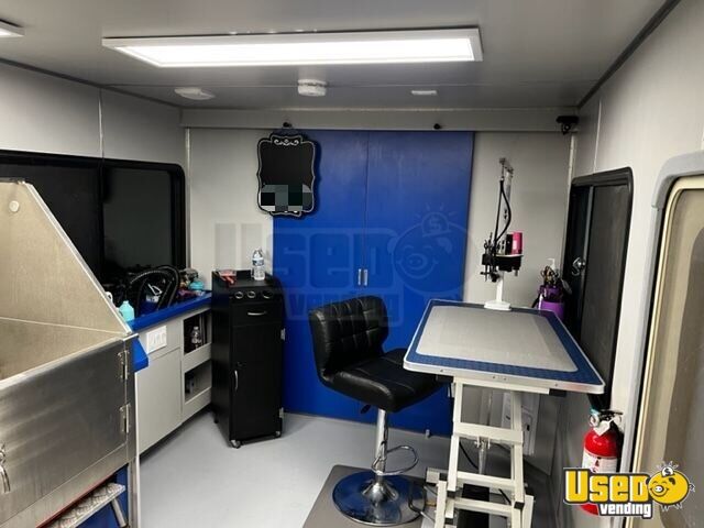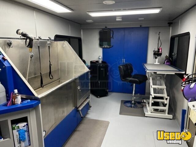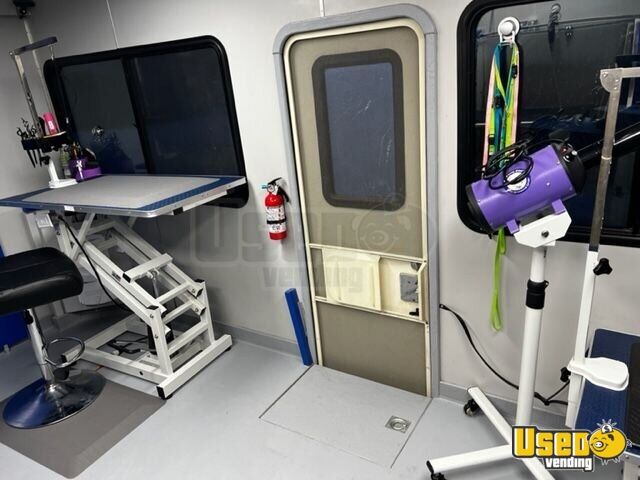The unit is set up with the following: 8 roof-mounted solar panels, propane on demand water heater, propane generator,120 volt AC and 24/12 volt DC power, Wifi, electrical hook-ups throughout, 2 grooming tables with lifts, 1 extra large washtub, 2 small/medium cages, 2 built-in air dryers, overhead A/C and heating pump unit, numerous storage cupboards. There is a set-up for a laptop computer in the front cabin that can be easily used while sitting in the passenger front seat.