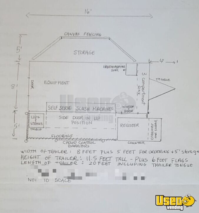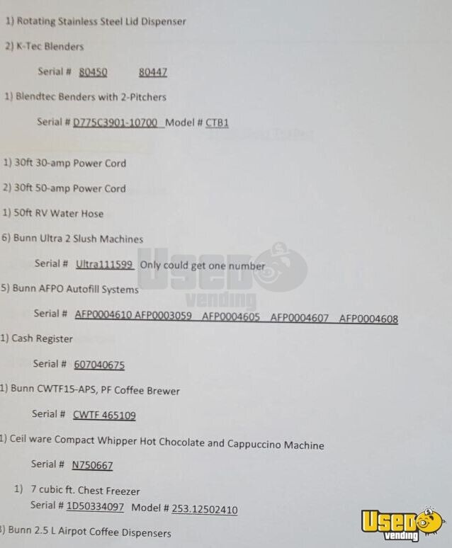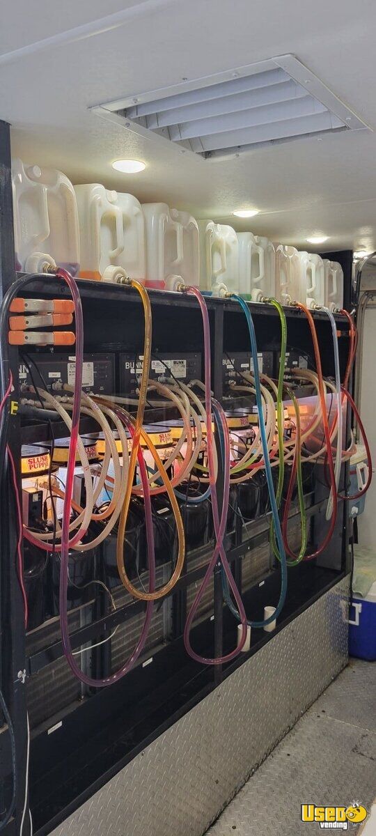 The trailer's interior was installed in 2010 and stands 6'8" high. The ceiling and some walls have been redone and this unit has a new wrap. The 5 machines can have up to 10 flavors.