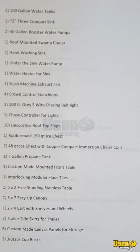 - 2 trailer side skirts; 8 custom made canvas panels for storage; 3 3-stack cup racks; rotating stainless steel lid dispenser; 50' RV water hose
