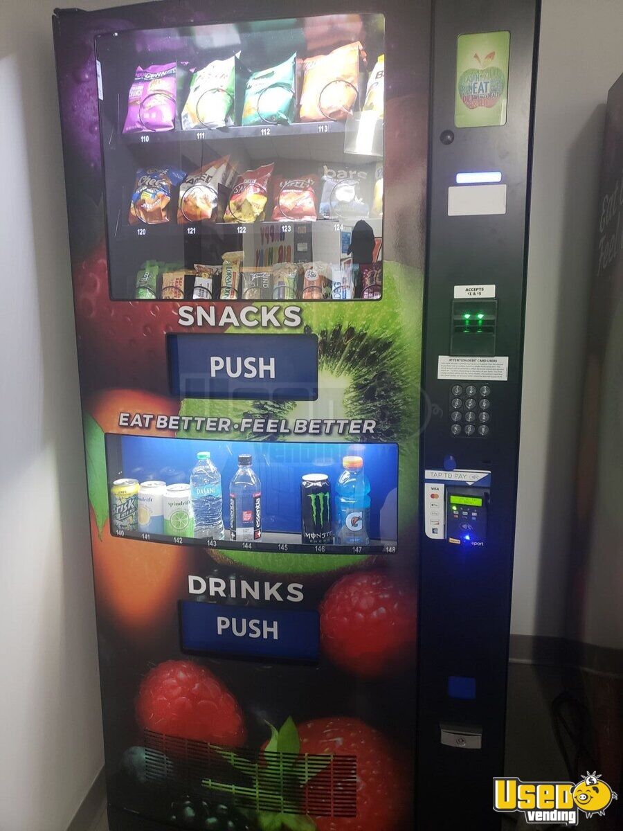 2024 HealthyYou HY2100 snack and drink combo vending machine. It has 29 Selections with 20 for snacks and 9 for drinks.9 Drink Choices, 20 Snack Choices, 120 Drink Choices. The seller states it is in great working condition. The machine offers both snacks and drinks in one unit, with a credit card reader and remote inventory monitoring capability. Includes bill acceptor, coin changer, and cashless payment system.