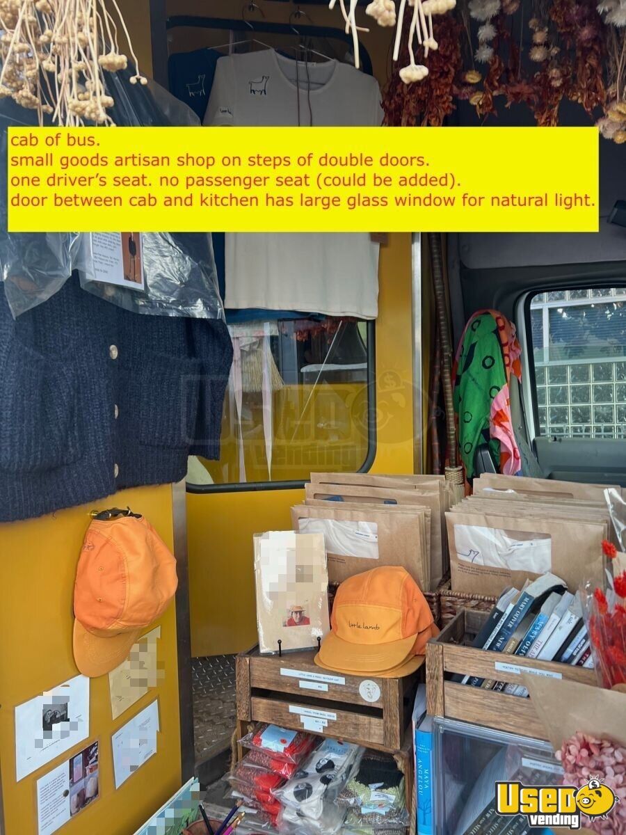 Powder coated stainless steel and aluminum on the interiors. The powder coating was done to add custom, warmth and ambiance to the shop. Converted shuttle bus selling artisanal coffee and artisan goods.