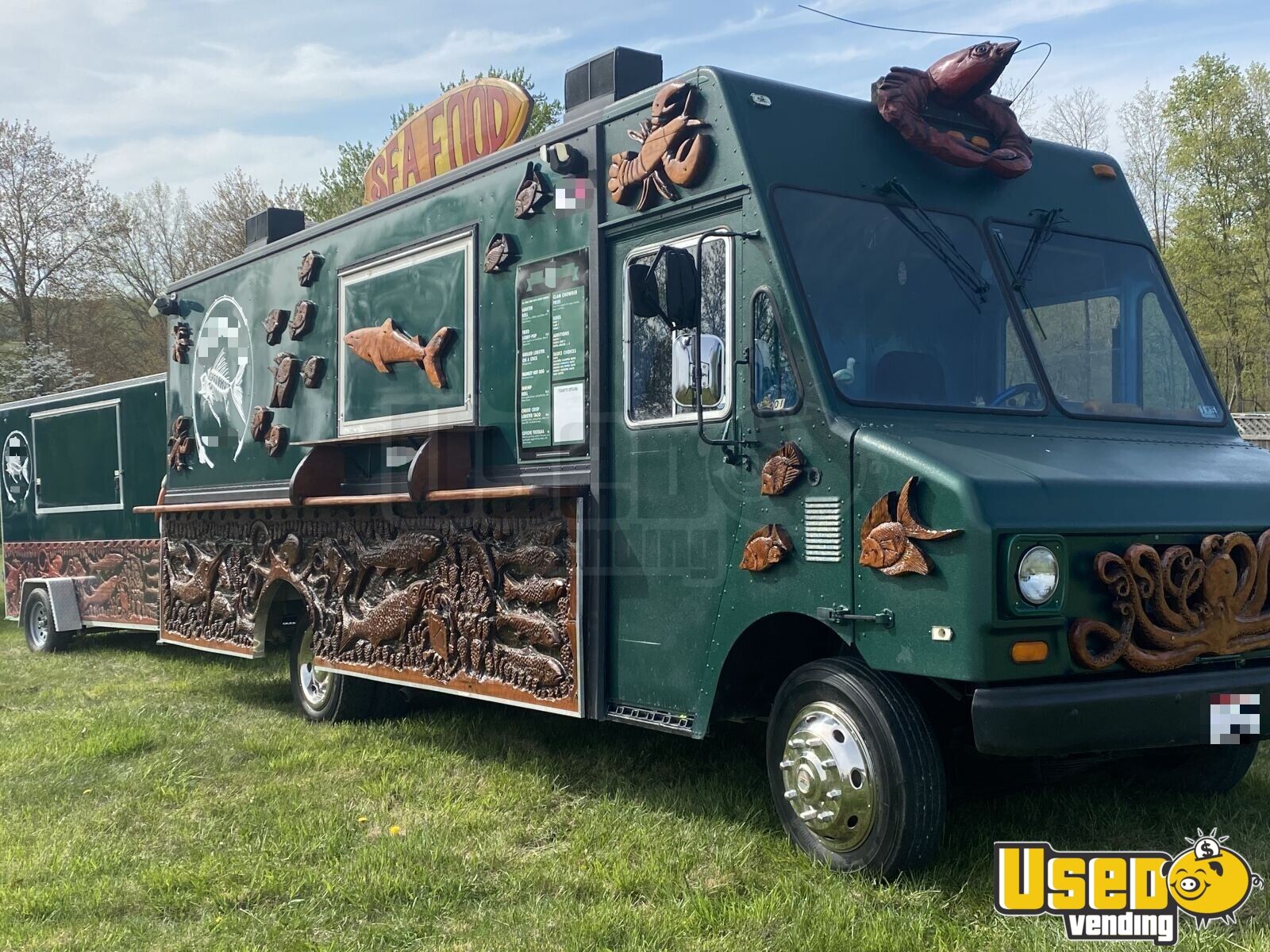 Just look at this fully functional truck, with the most beautiful hand carved cherrywood ocean scenery on the truck panels! Be different from the rest - this class act loaded Chevrolet kitchen food truck has a matching storage trailer, both of which can surely turn heads and draw more attention to your business!