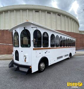 Here is a nicely outfitted white wedding trolley bus with limousine seating. It can accommodate 30 passengers and is still being rented out. It has the Cummins diesel motor and Allison transmission.