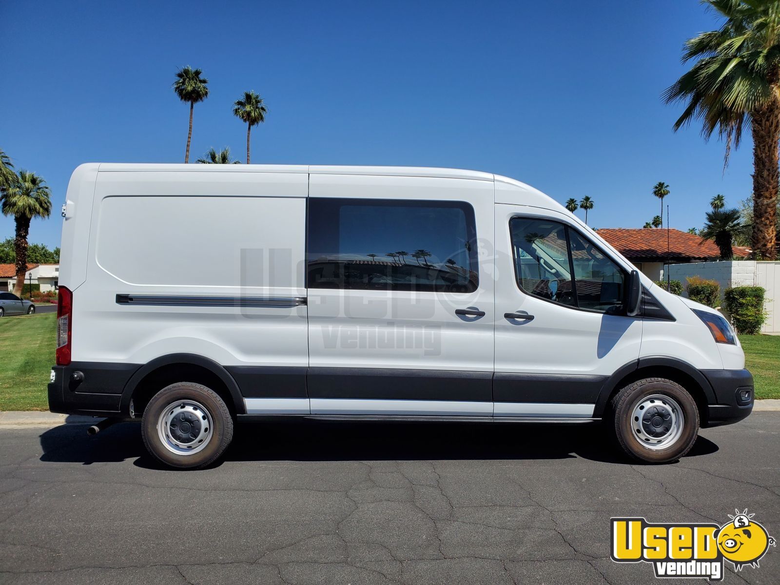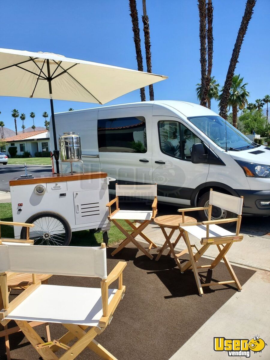 separate pricing: All lounge equipment and furnishings (chairs, tables, rugs, umbrellas, coolers on stands), an upcycled Ferla roaming cart with hand sink, and a 2020 Ford Transit 250 Mid-Roof for towing and extra cargo transportation.
