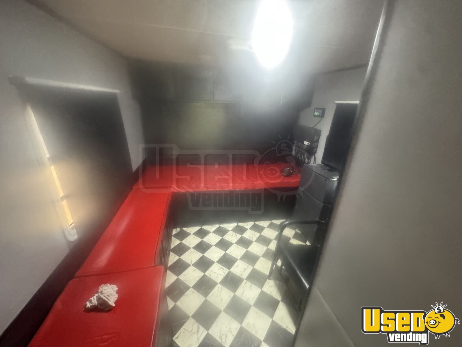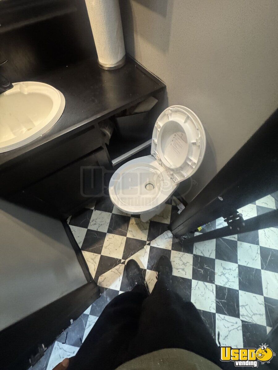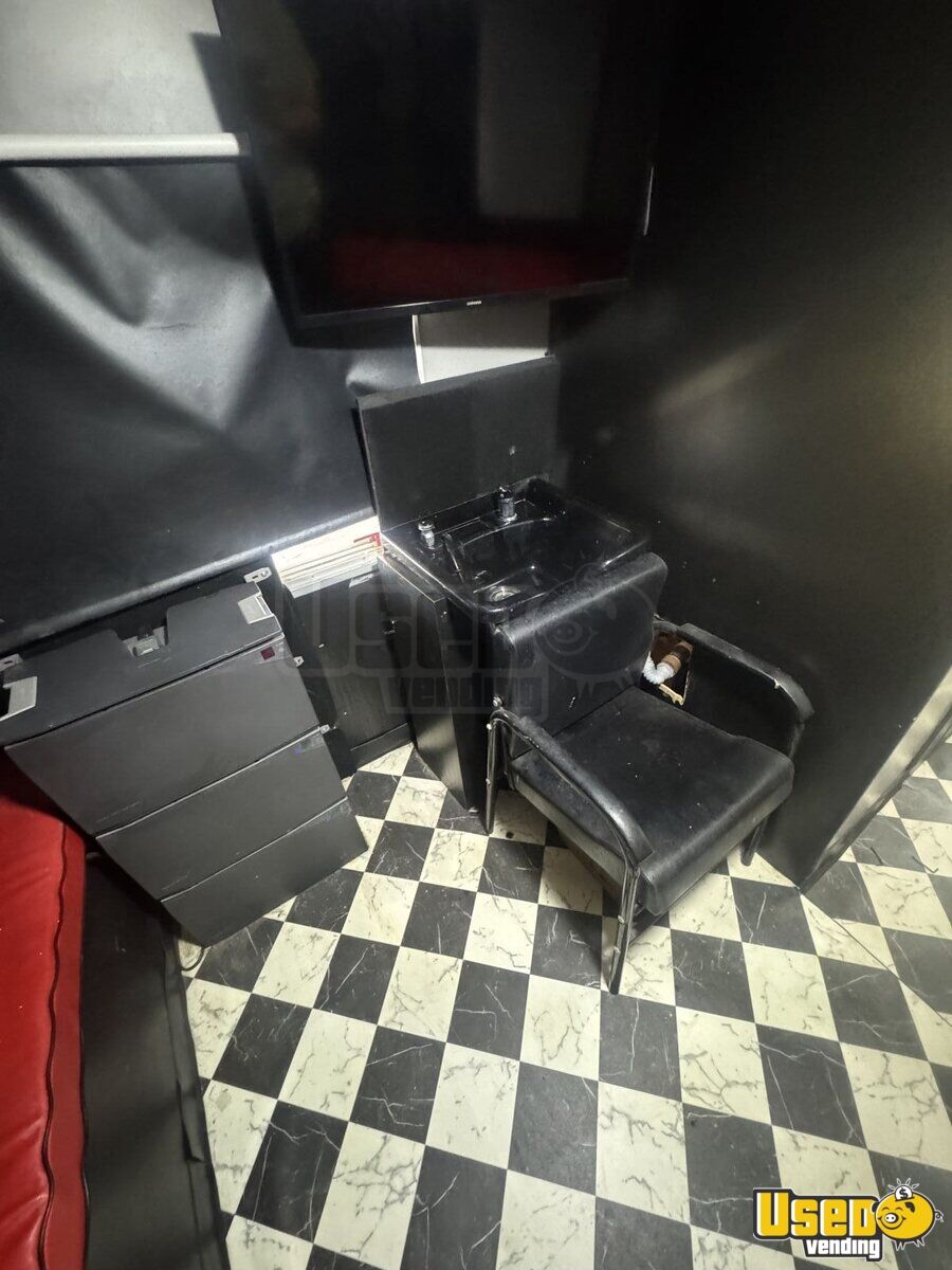 Currently set up for two barber stations, with potential set up for three. Shampoo bowl located in rear of vehicle. Shampoo bowl, bathroom sink and toilet draw water from the 100-gallon water tank located under the bench in the rear of vehicle. Ample storage both inside and under the cabin. Plenty of customer seating in the front and rear of the vehicle.