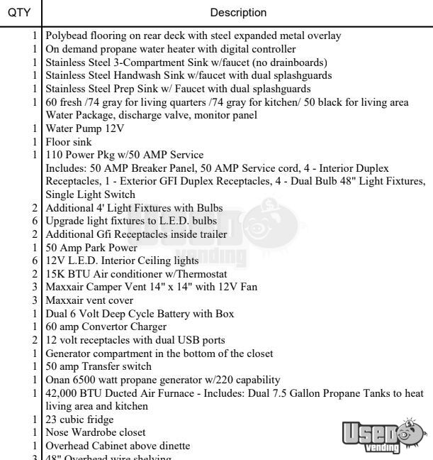 - Gray Water Tank: 74 gallon in kitchen & 74 gallon in living quarters