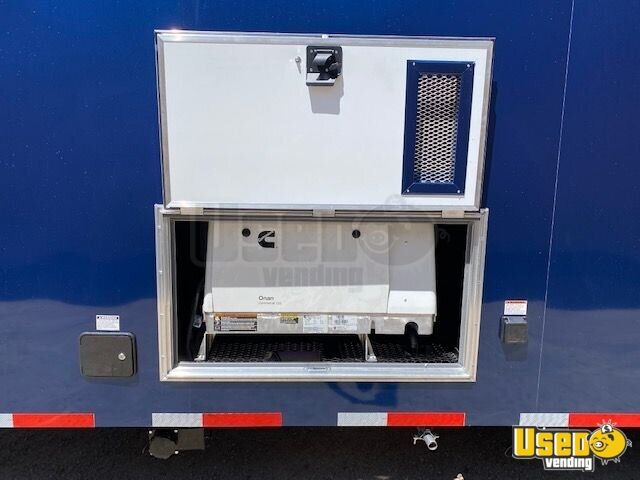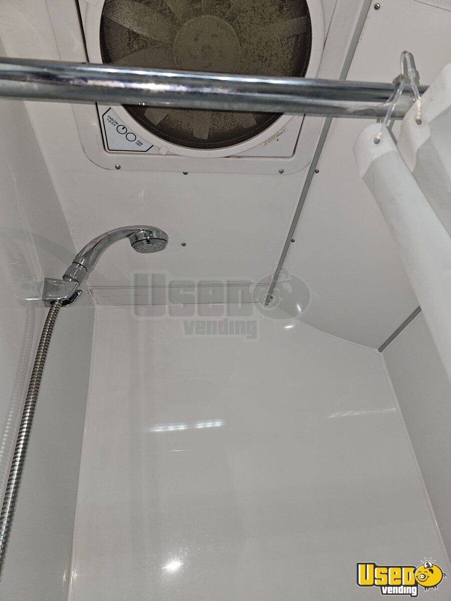 This gooseneck trailer measures 34' long and has a commercial kitchen, barbecue porch, and living quarters with dinette, bed and bathroom with shower. Appropriate for disaster relief as well as industrial catering. Has onboard generator.