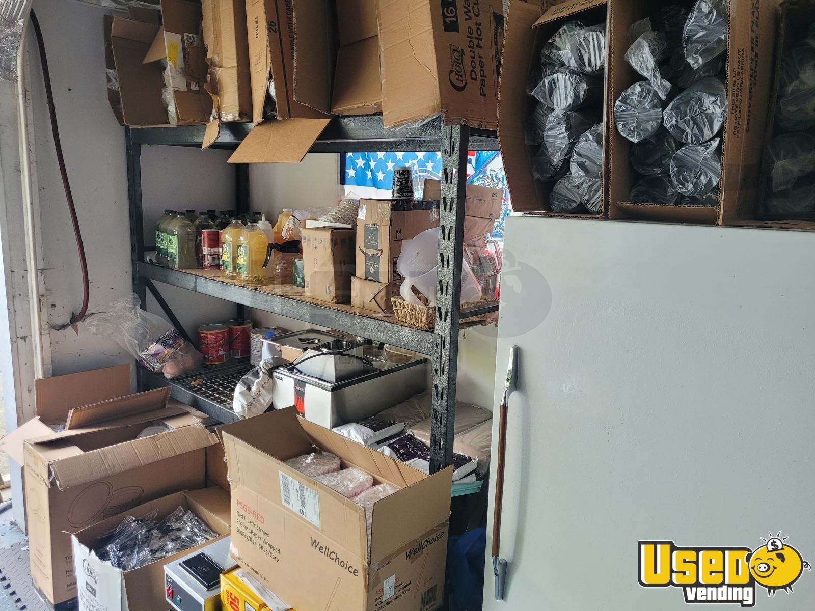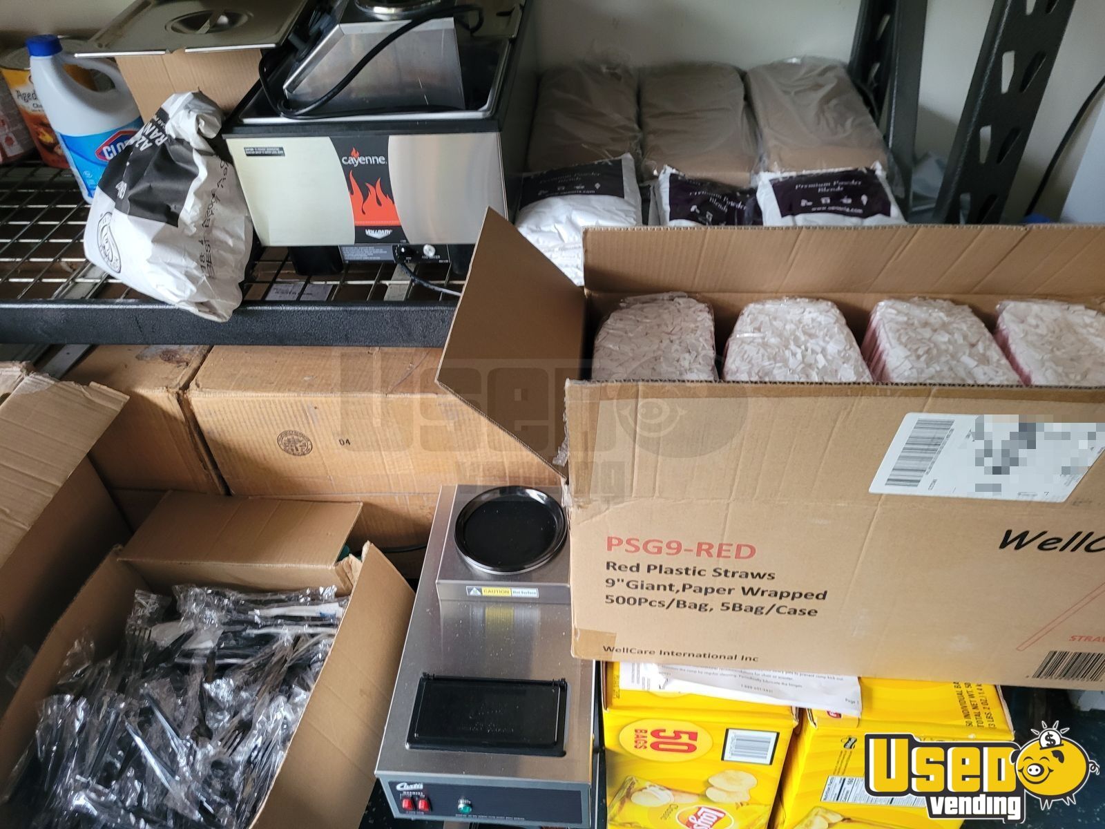 - Plastic utensils, coffee cups, 32oz lemon shake-up cup, straws, lotus syurp for shake-ups. Few cans of chili, few cans of nacho cheese, cappuccino podwer mix