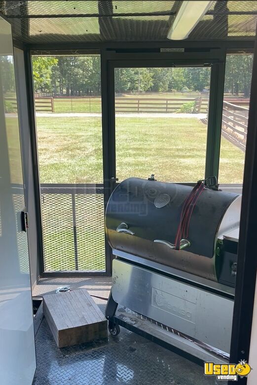 This barbecue food trailer combines functionality with appeal, offering a spacious layout and a screened-in porch designed for grilling efficiency. It's in good condition, ready to serve any barbecue business looking for a standout setup. Don't miss out, call us now!