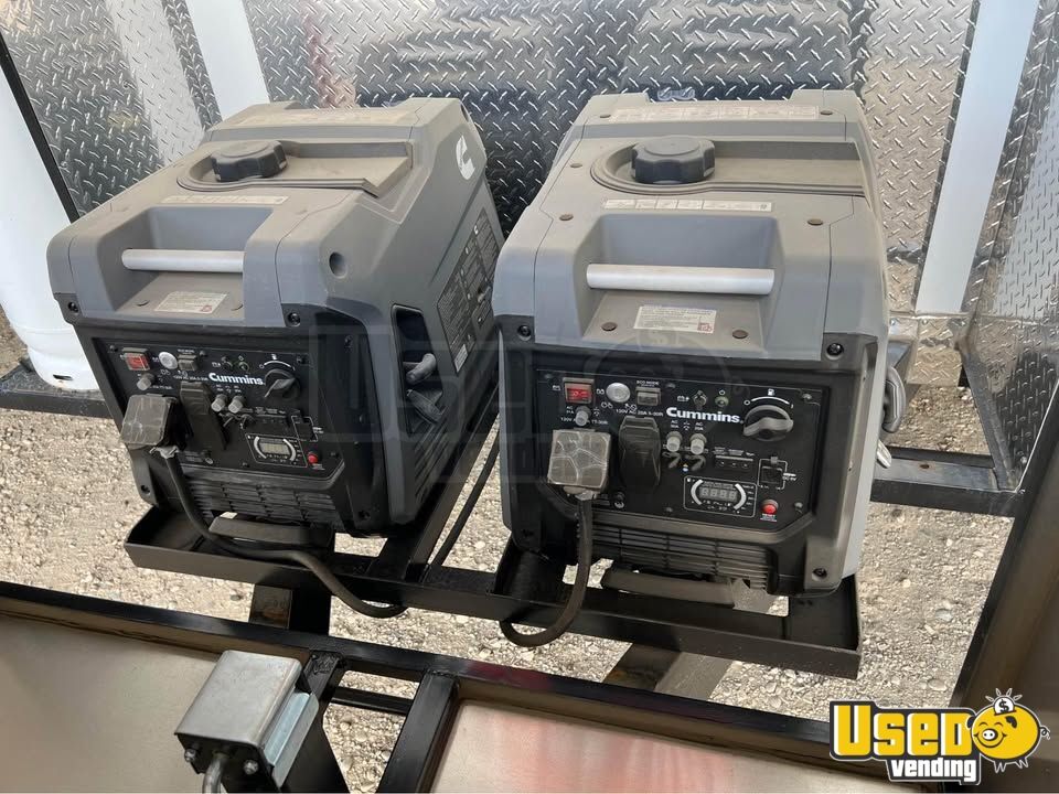 Notable highlights include: - Dual concession windows and fold-down exterior counter - Stainless steel interior with diamond-plated flooring - 8' hood with exhaust fan and Pro Fire Suppression System - 24" griddle, 4-burner stovetop, 40 lb fryer, and steam table - Multiple refrigeration units, including prep cooler and chef base - Dual 25G propane tanks and two Onan 4500 generators - 3-compartment sink, two additional sinks, and 45/55 gal water tanks