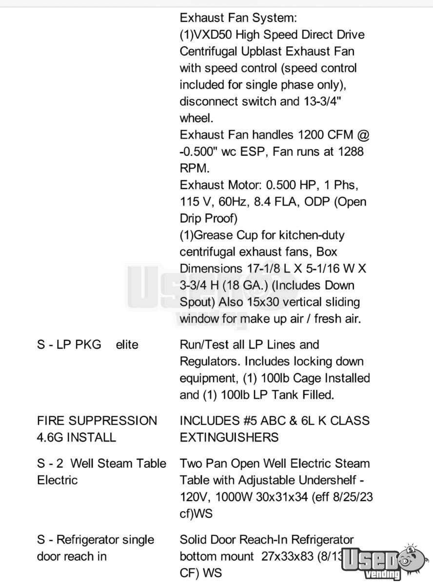 Standout features include: - Full fire suppression system with two extinguishers - Dual 40# fryers, 36" griddle, 6-burner range, and large oven - Upright reach-in refrigerator, chest freezer, and beverage fridge - DuroMax dual-fuel generator and two 25-gallon propane tanks - 10’ vent hood with AirExcel Coleman Mach A/C unit