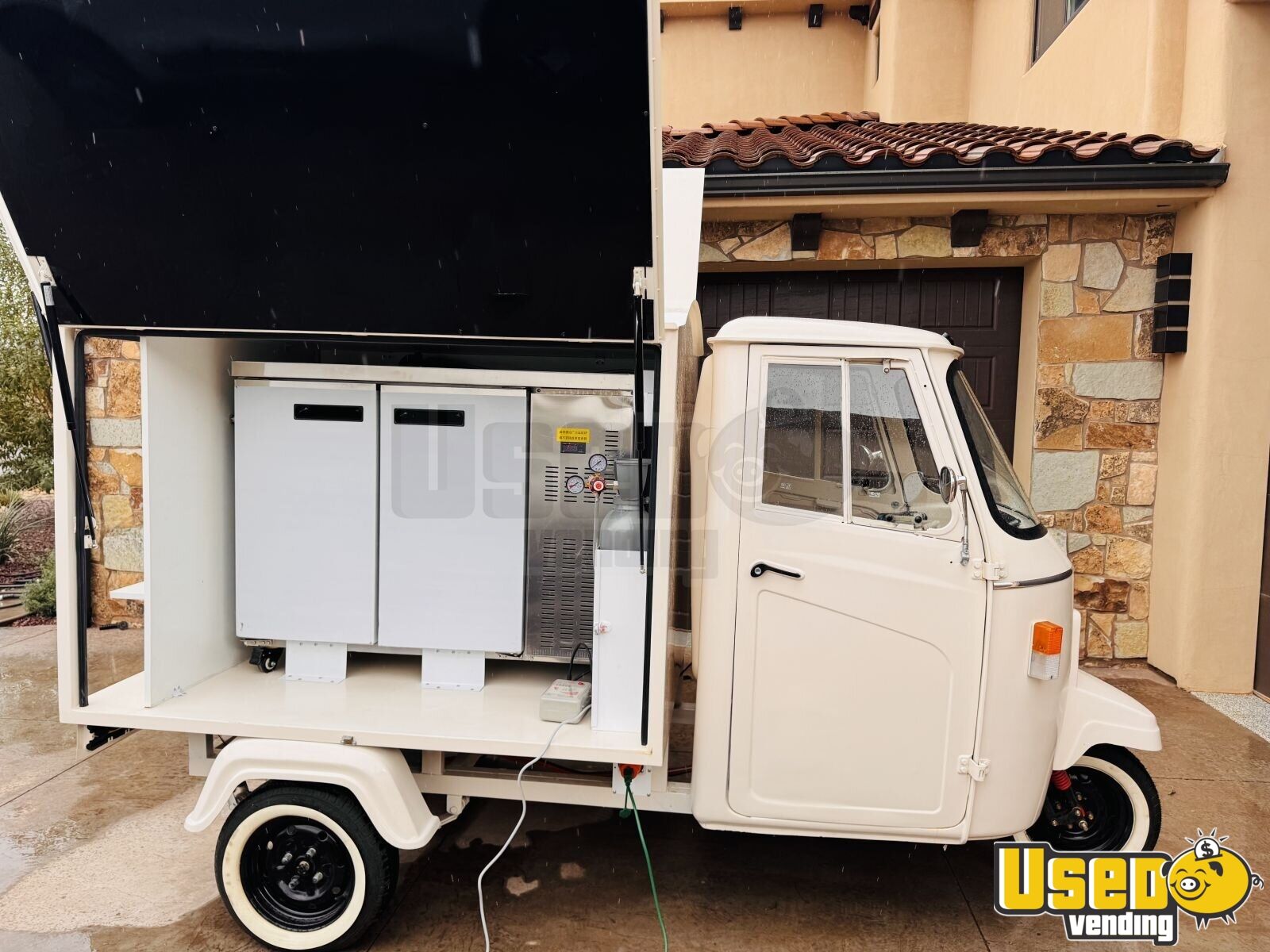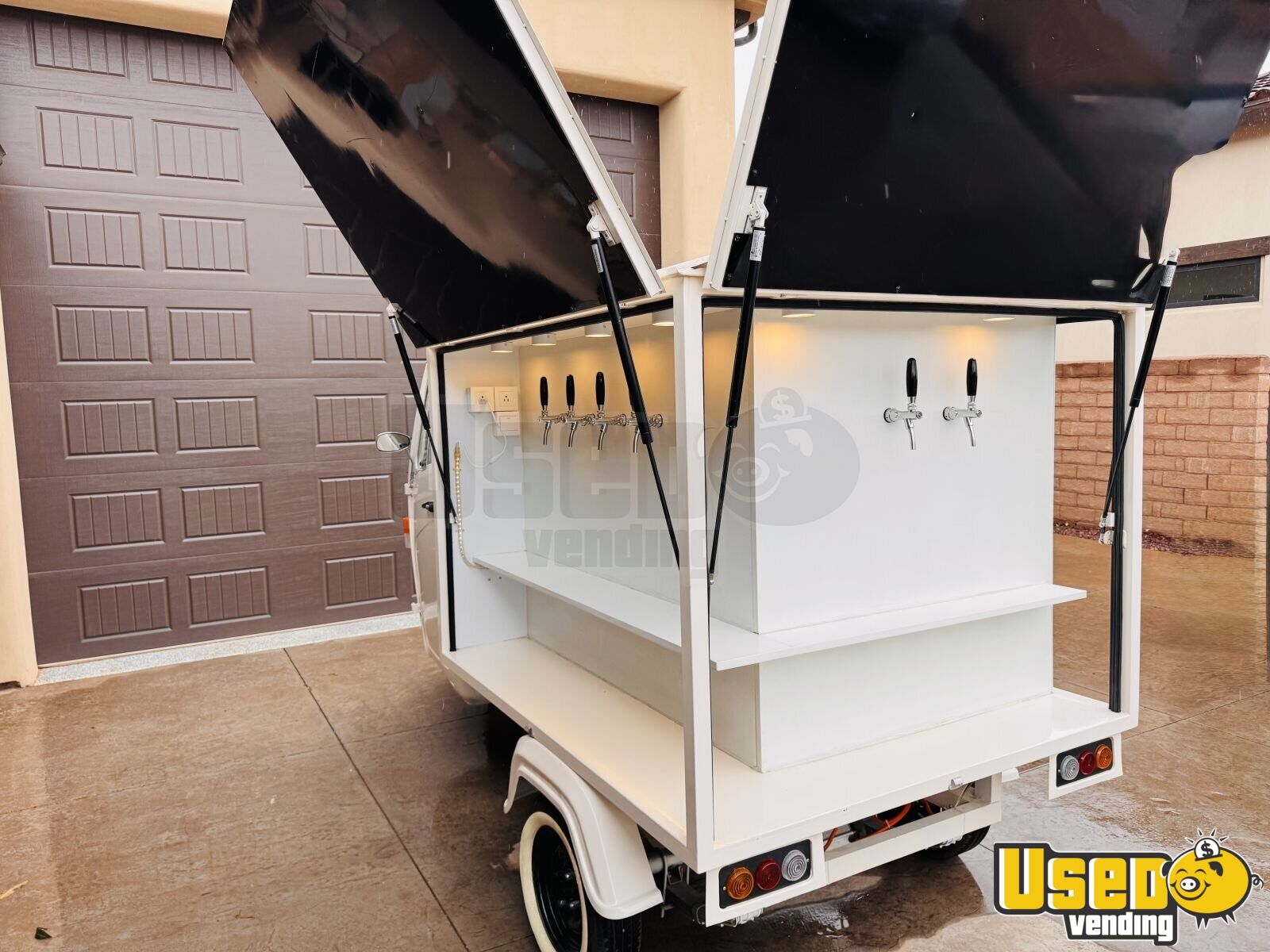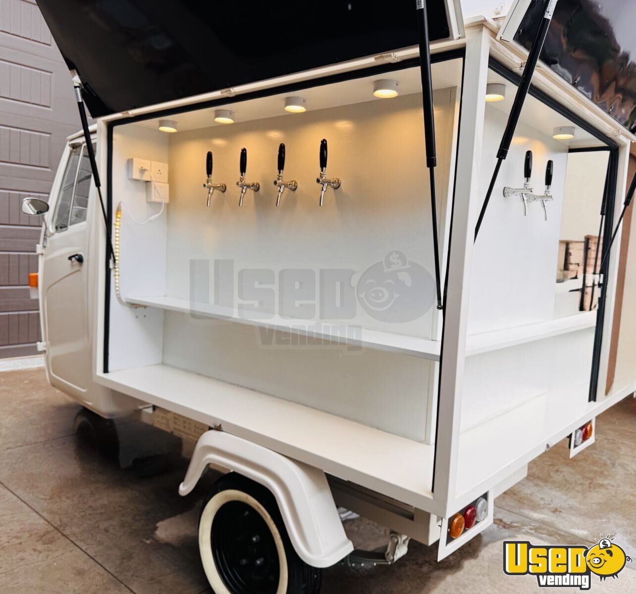 This NEW Piaggio Ape beverage tap tricycle is a compact, electric-powered mobile bar built for instant business use. Never used and in good condition, it includes a complete keg and tap setup, cooling system, and lighting—ideal for serving beverages at weddings, festivals, or corporate events. Make it yours by calling us now!