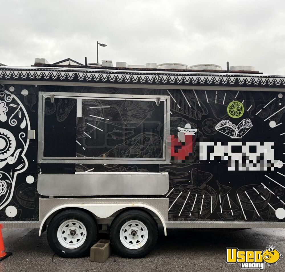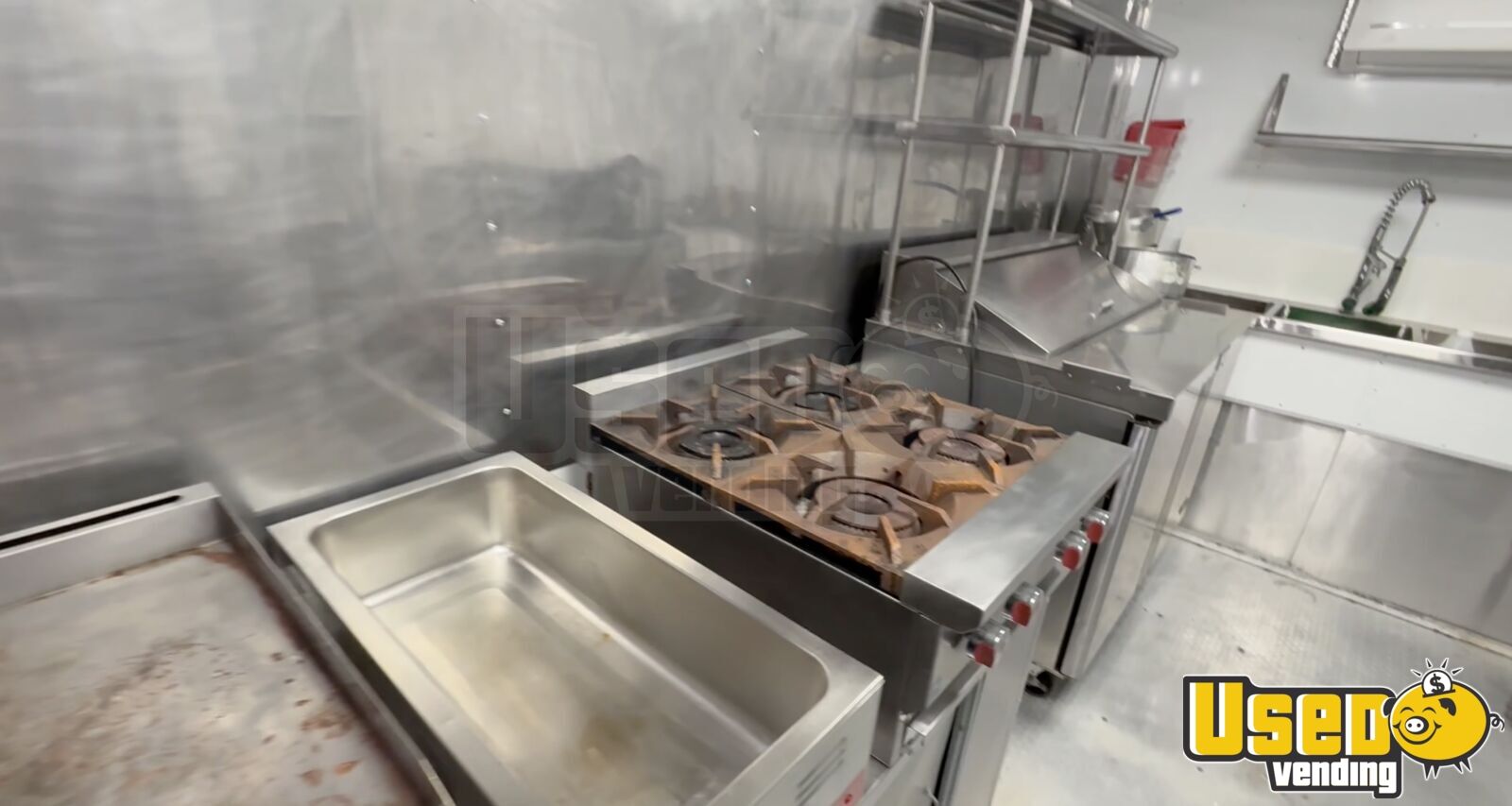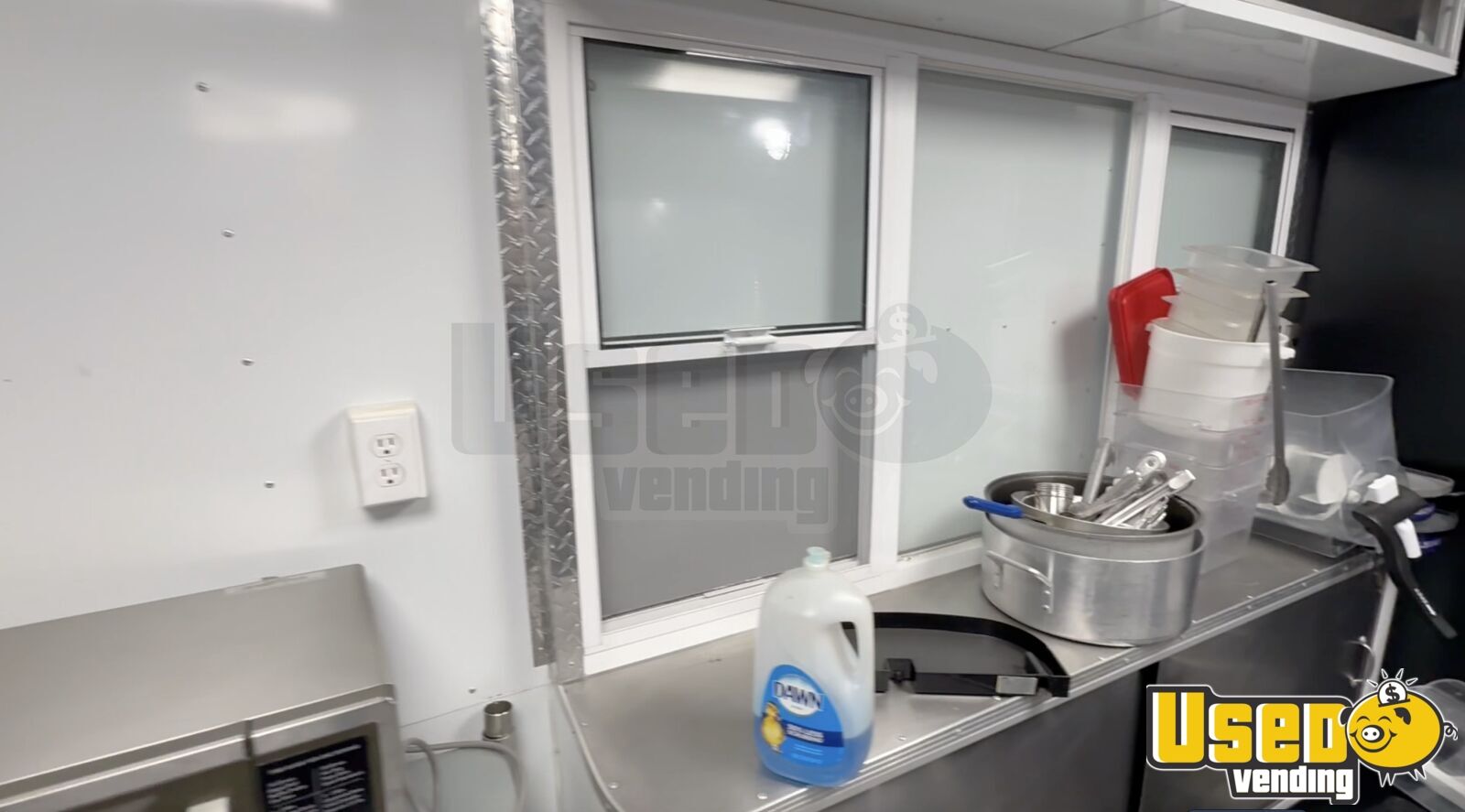 Standout features include: - Air conditioning (front) - Concession window - Stainless steel wall covers - Propane system (100lb tank) and shore power cord - Refrigerator and prep cooler - Full cooking line with stovetop, flatgrill, and microwave - Exhaust hood and fire extinguisher - Complete plumbing setup with triple sink and water tanks