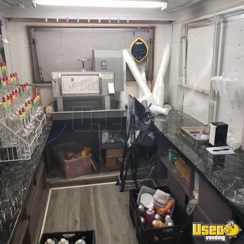 Start generating profits instantly with this turnkey snowball and ice cream concession trailer, currently serving snow cones, ice cream, and cotton candy, but fully equipped for additional menu options. It features sliding door cabinets to protect equipment during transport, tiered racks with glass flavoring bottles and pouring stoppers, and a Southern Snow ice shaving machine for smooth operation. Call us now to make it yours!