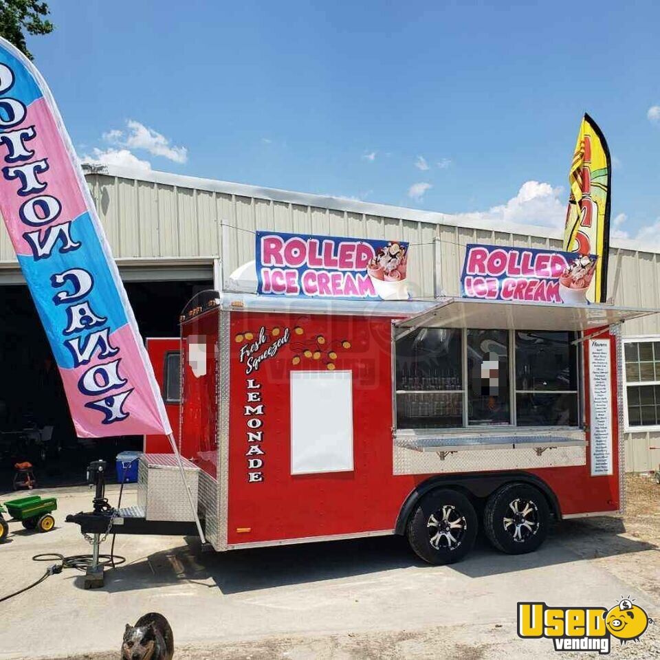This unit includes a portable Predator super-quiet inverter generator with 7,600 running watts, six plastic bins filled with cups, ice bags, utensils, and all necessary supplies. It also features a chest-deep freezer stocked with ice cubes designed to fit directly into the shaving machine chute, a hand-washing station with a new faucet, fold-out serving bars, advertising flags, automatic levelers, multiple power connectors for any power level, a secure trailer hitch lock, a hot water tank, a brand-new battery, an AirXcel top-mounted AC unit, and an outdoor whiteboard.