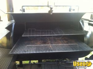 Triple Threat BBQ kitchen is composed of a 6 ? ? reinforced steel channel tandem trailer (26 ? ? x 8 ? ? -6 ? ? ) with heavy duty angle iron undercarriage railing with interior wood floor deck. There is fold up steps at the entry gate that provide interior access to three separate grills to keep you off the ground while cooking. All grills are set up for LP gas, charcoal, and/or wood. T-1 ( 8.33 ? ? x 40 ? ? dia.) One compartment two rack 5230 sq. in. cooking surface pit with indirect heat accessed by one 58 ? ? door. T-2 (9.5 ? ? x 30 ? ? dia.) Two compartments three rack 6280 sq. in. cooking surface grill with direct heat accessed by two 44 ? ? doors. T-3 (7 ? ? x 24 ? ? dia.) One compartment two rack 2520 sq. in. cooking surface pit with indirect heat accessed by two 32 ? ? doors.