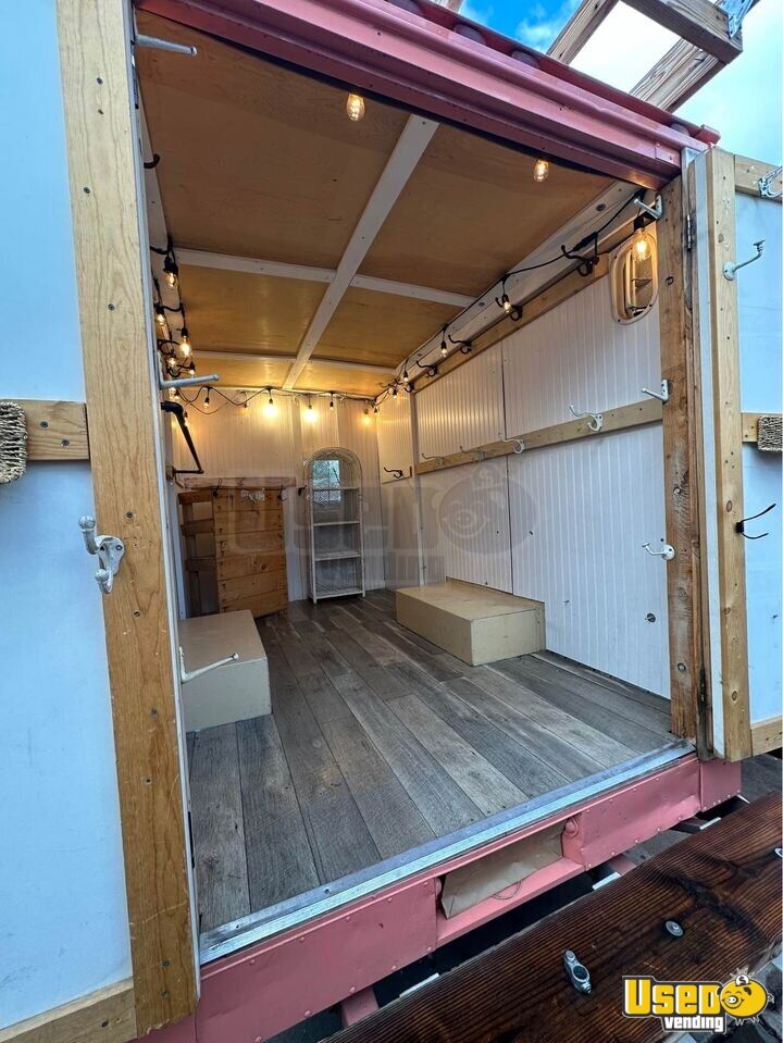 Fully equipped mobile business with 20ft length, custom steps, white bead-board walls, faux-wood floor, wainscoting ceiling, hooks and rods for hanging clothing, and checkout station.
