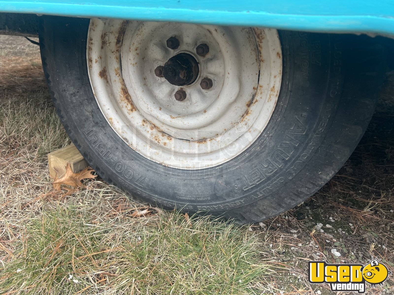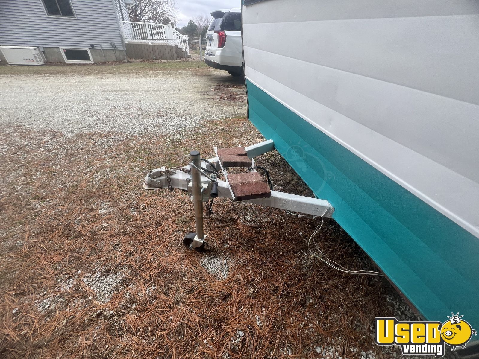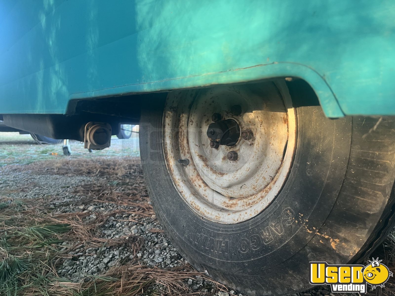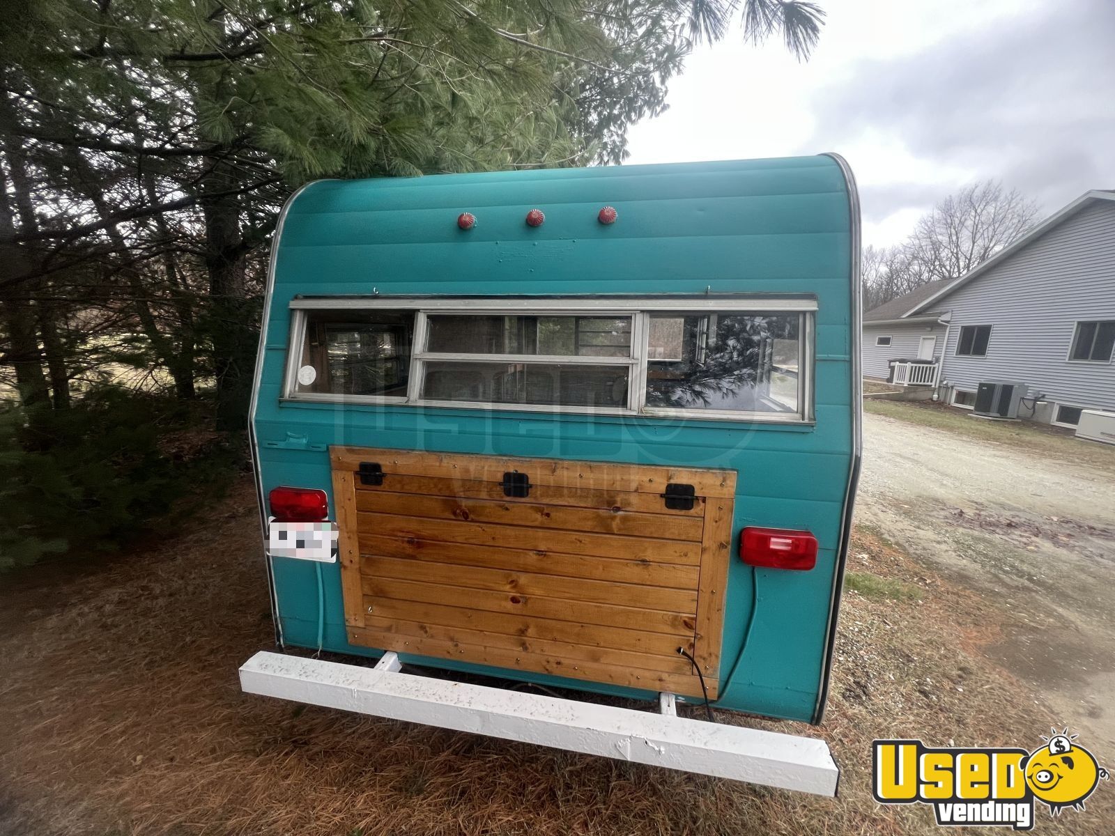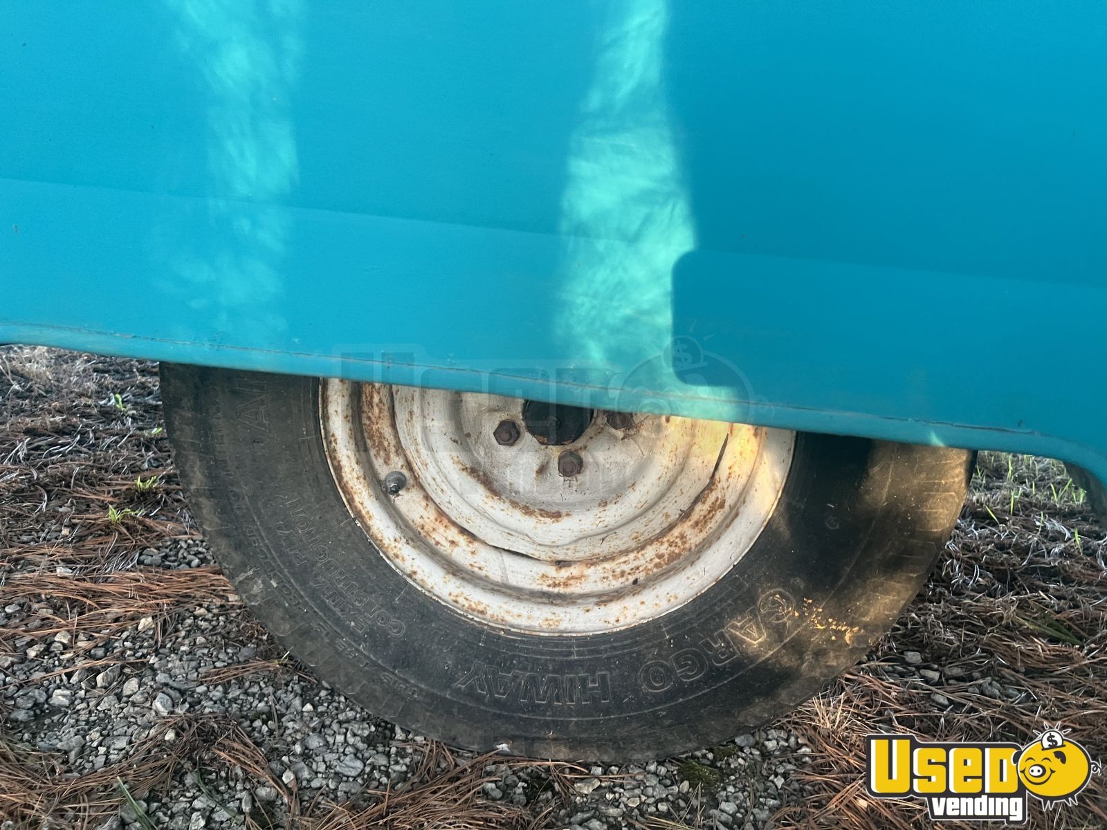 This classic canned-ham style trailer features iconic turquoise and white exterior paneling, solid frame, and original windows that add charm and curb appeal.