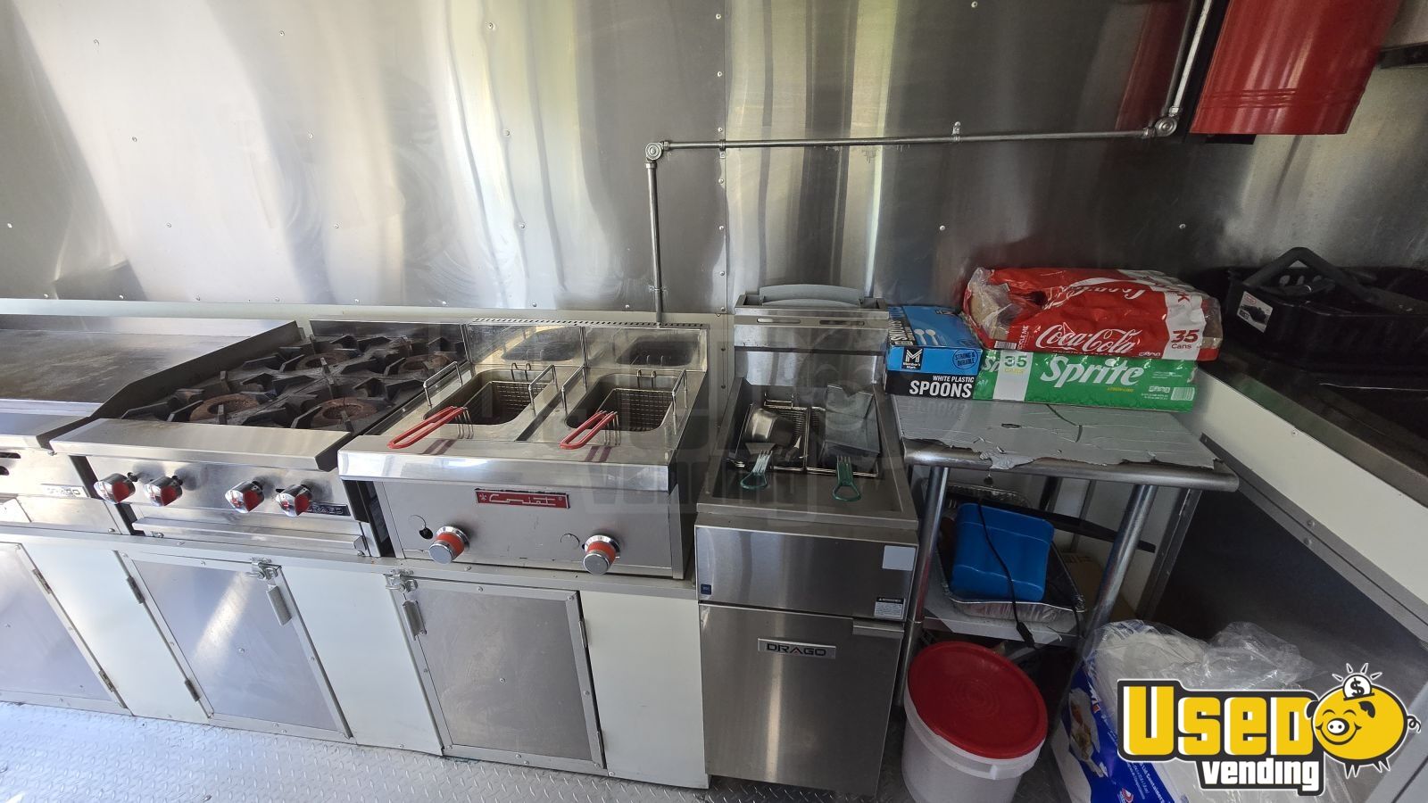 - Four burners, four fryers, a 48" griddle, and prep cooler
