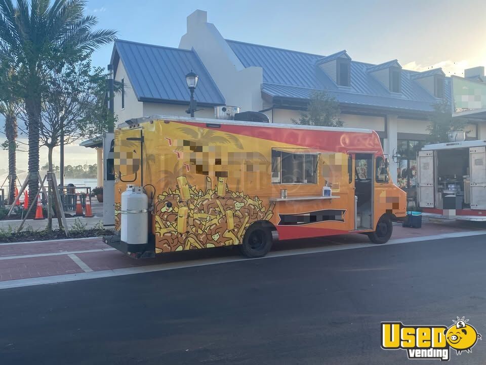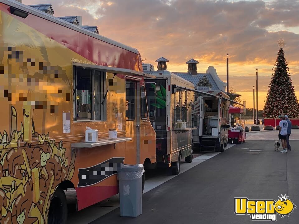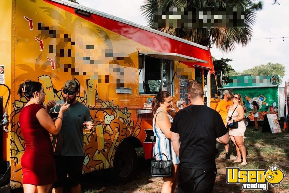 Standout features include: - Air conditioning - Concession window - Refrigerator and 27" prep station cooler - 4-burner stovetop and flat grill - Single and double fryers - Exhaust hood, lighting, outlets, and hot water heater