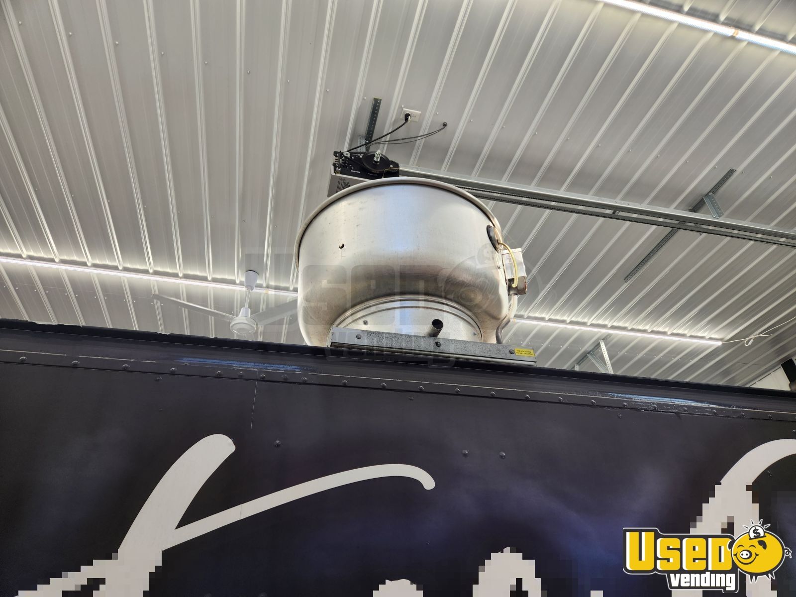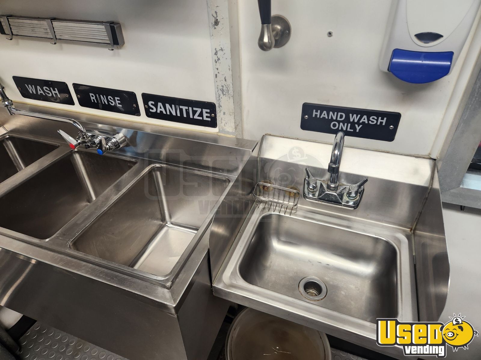 Key highlights include: - Ansul fire suppression system - Double oven with 6-burner stovetop and flatgrill - 75 lb, 3-basket fryer (requires service) - Upright refrigerator and half freezer - Triple and handwashing sinks - Large service window with awning - 100 lb propane tank, water tanks (40/50 gal), and storage racking