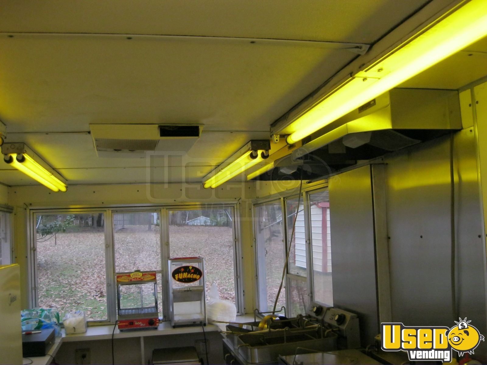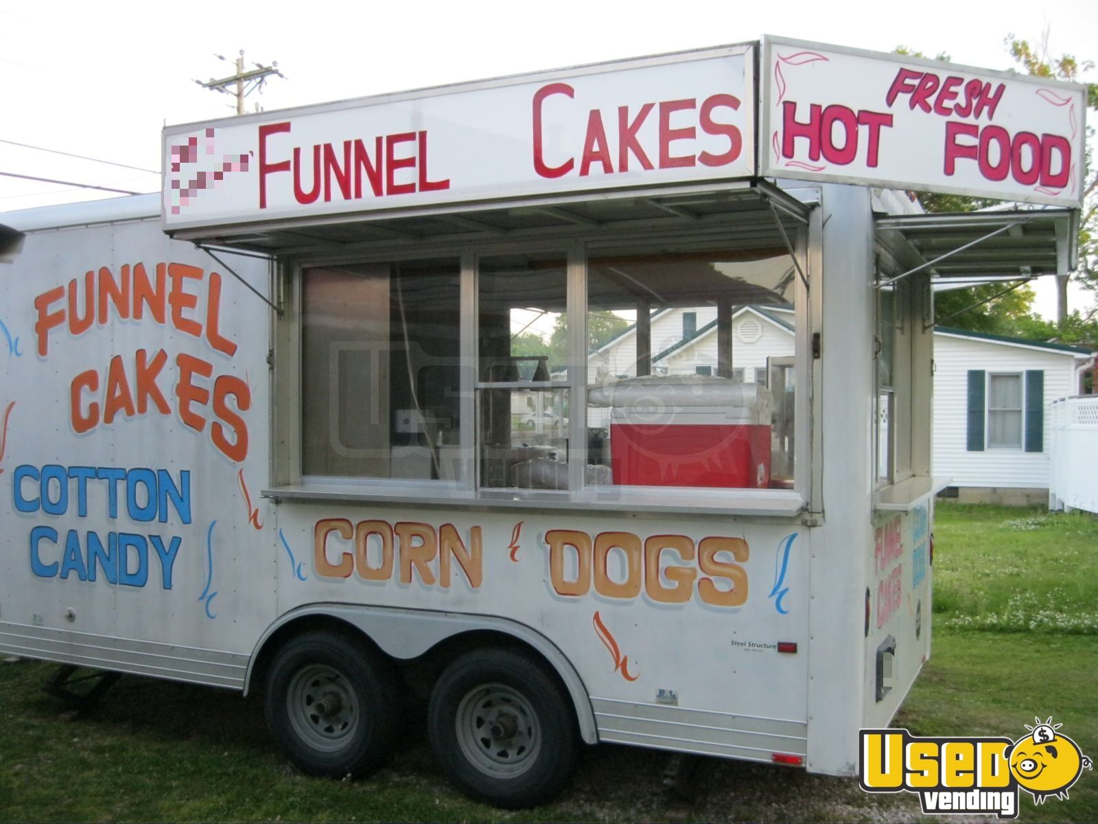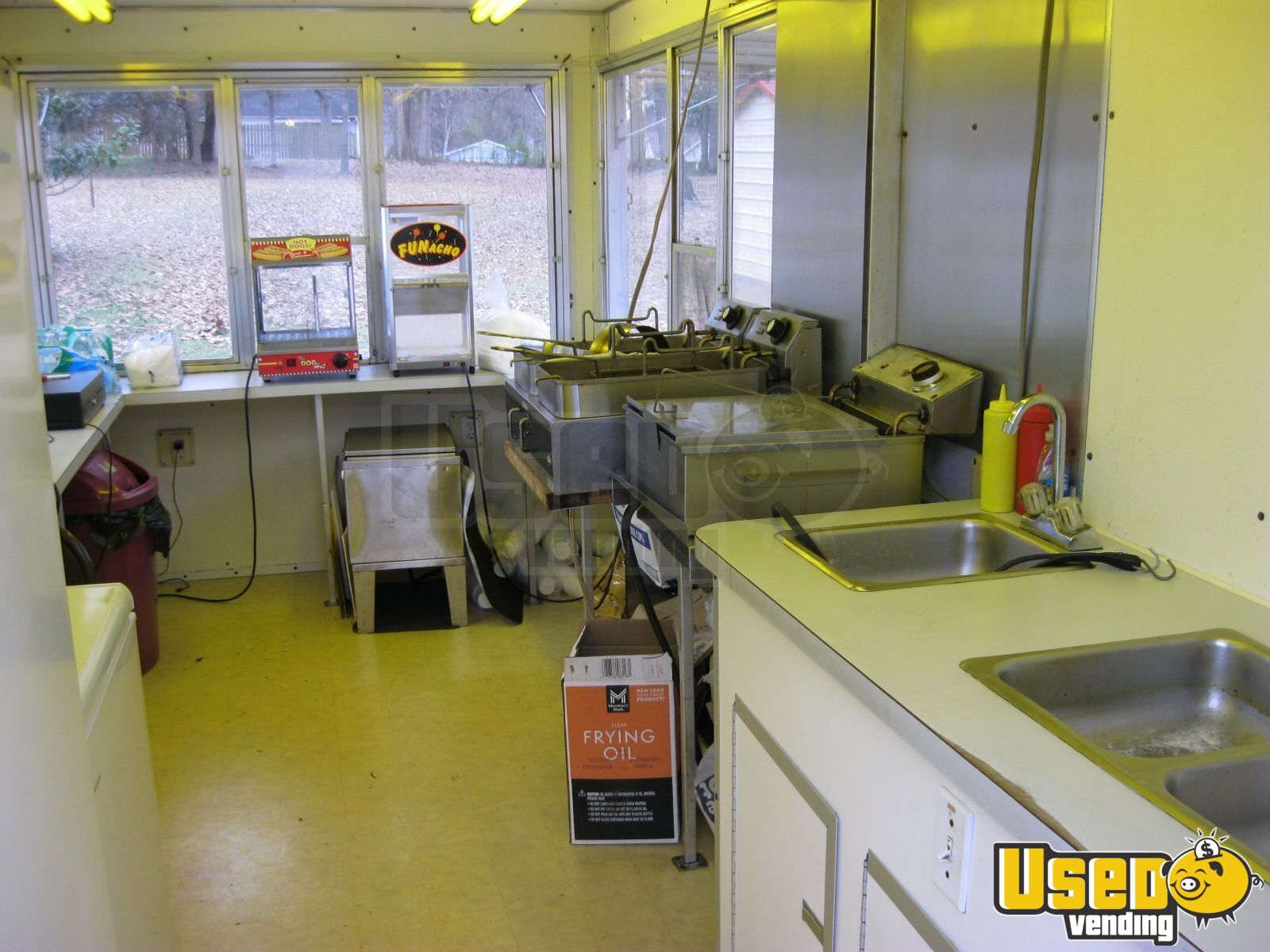 Equipped with a full kitchen setup ideal for funnel cakes, hot dogs, and more, standout features include: - Triple fryers and food warmers - Refrigeration and chest freezer - Exhaust hood with fan and fire extinguisher - Triple sink and 6-gallon water heater - Removable hitch and exterior lighting